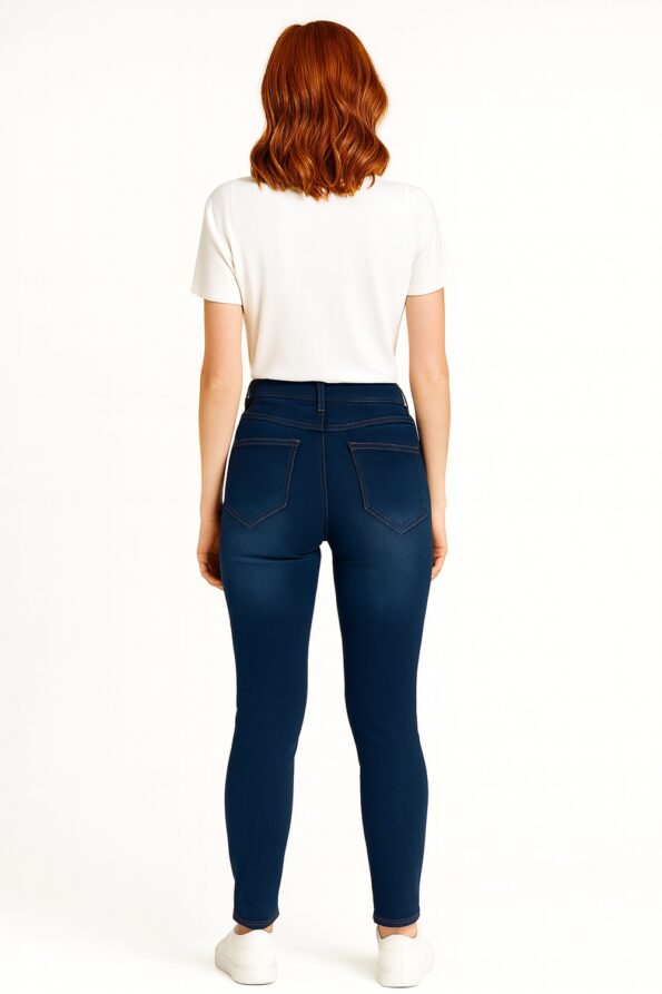 Pantalón skinny de mezclilla con tiro alto diseñado para estilizar la figura y realzar la cintura, cuenta con pretina ancha de tres botones que aporta soporte y un ajuste firme, confeccionado en tela elástica que se adapta al cuerpo brindando comodidad y libertad de movimiento, corte ceñido que alarga visualmente las piernas y resalta la silueta, ideal para crear looks casuales y modernos en cualquier temporada, una prenda versátil y en tendencia que no puede faltar en el guardarropa