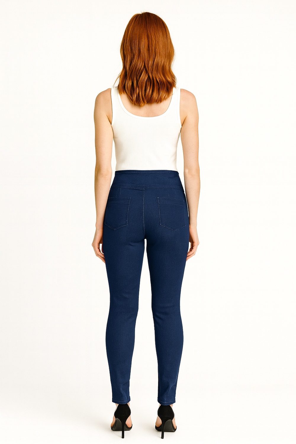 Pantalón de tiro alto con pretina amplia que brinda control y ajuste seguro, silueta ajustada a lo largo de la pierna que define la figura, botonadura decorativa frontal que aporta detalle visual, confección en tejido con elasticidad que permite libertad de movimiento, largo completo con terminación limpia