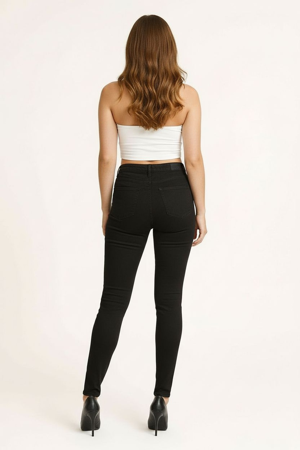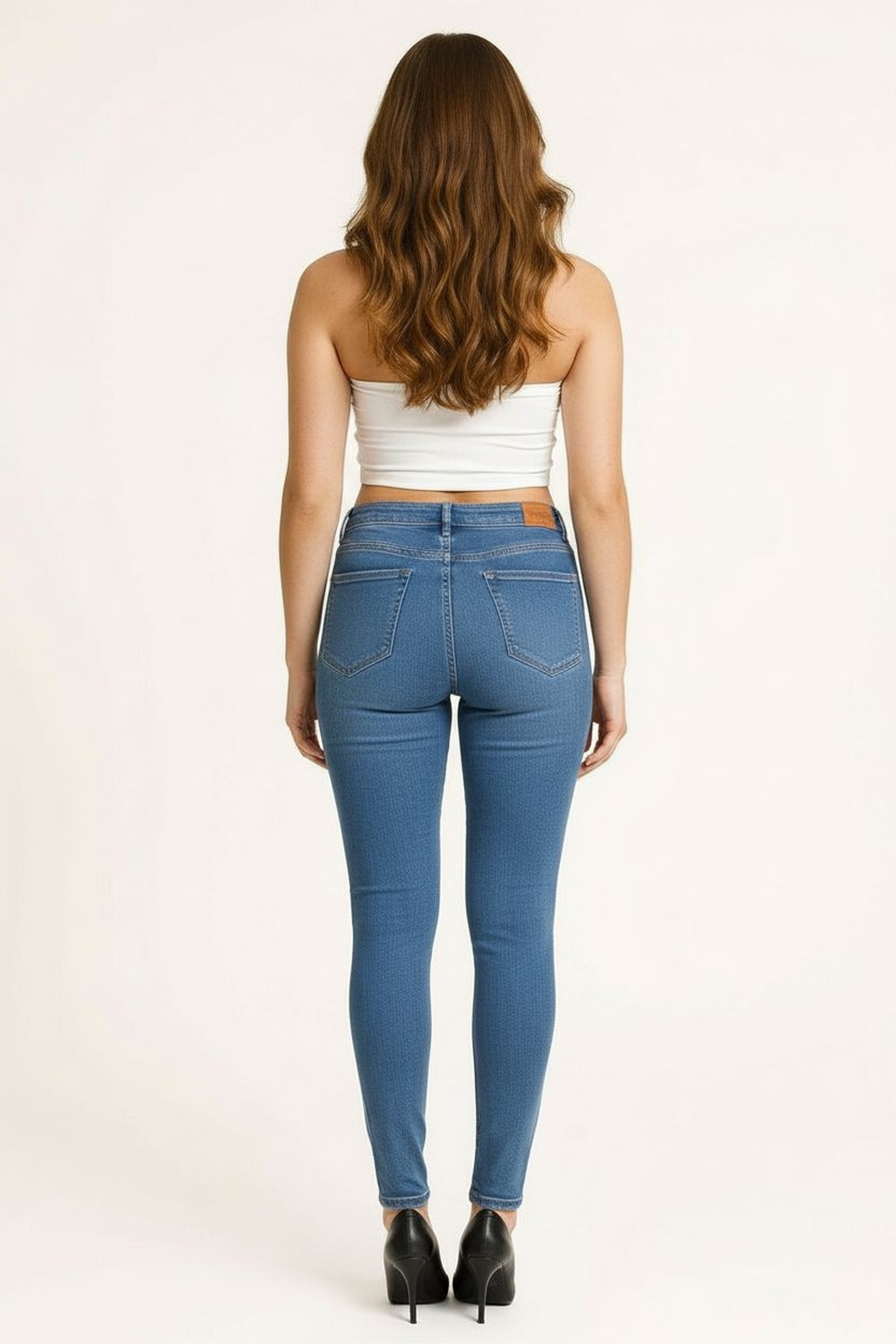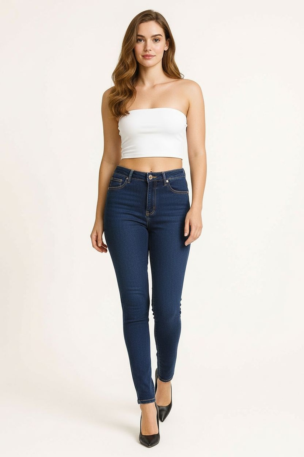Jeans corte ajustado con pretina alta, cierre frontal con botón y cremallera, diseño que realza la silueta, estructura firme con acabado limpio