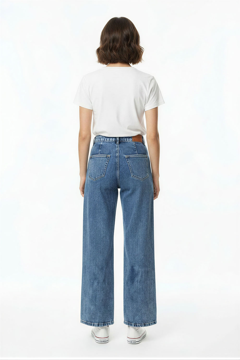 Jeans de tiro medio con corte amplio de pierna recta que aporta comodidad, diseño de cinco bolsas funcionales que brindan practicidad, cierre frontal con botón y cremallera para ajuste seguro, aplicaciones decorativas en pierna que añaden un toque distintivo, confección en mezclilla resistente con estructura firme y caída recta hasta el tobillo