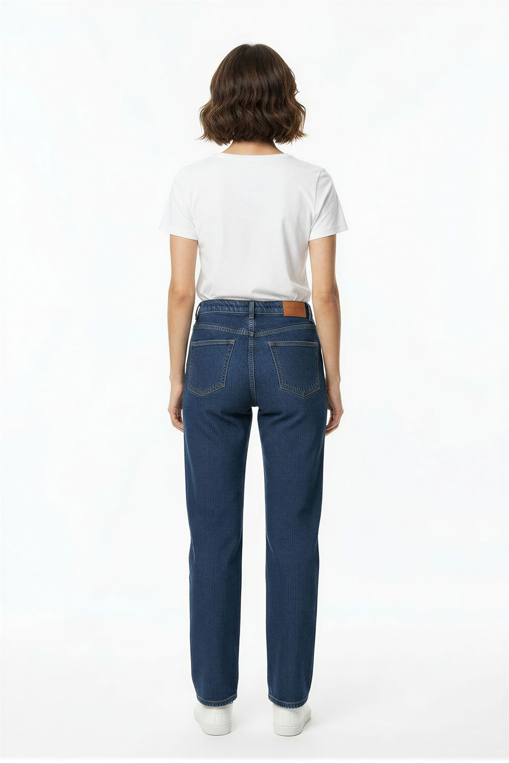 Jeans de tiro medio con corte recto que alarga visualmente la pierna, confección en mezclilla rígida de estructura firme, diseño de cinco bolsillos funcionales, pretina con trabillas y cierre frontal con botón metálico y cremallera, acabado limpio en bajo que aporta equilibrio en la silueta