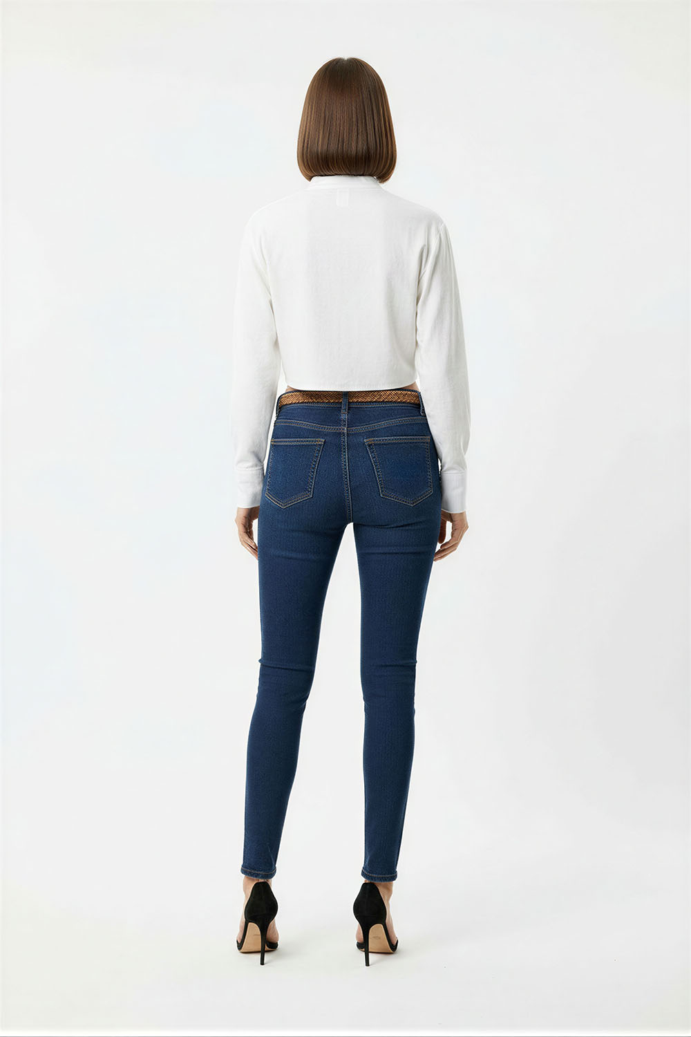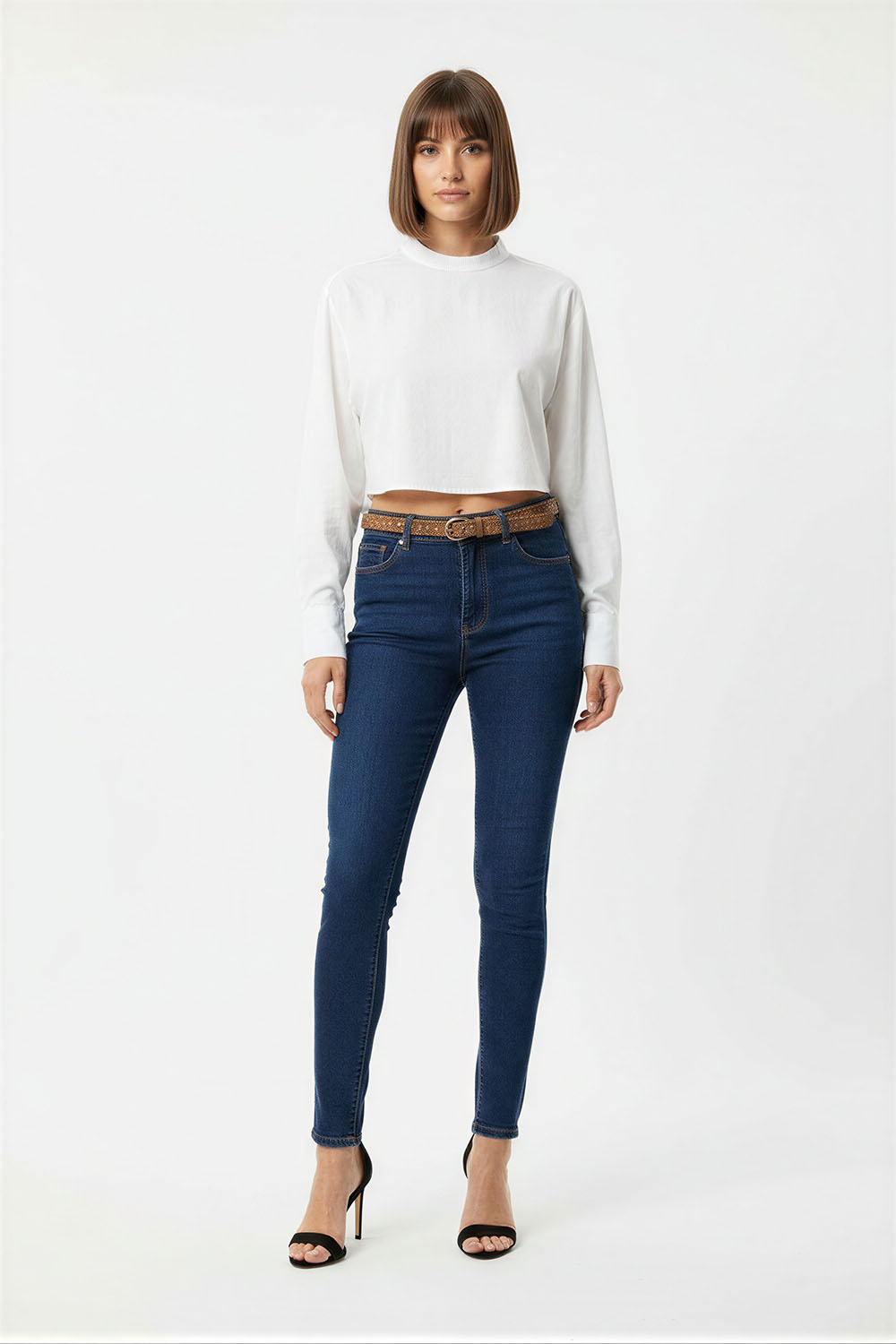 Jeans de tiro medio con cinturón con ojillos que permite ajuste personalizado, diseño de cinco bolsas que brinda practicidad, corte skinny que se adapta a la silueta, confección en mezclilla con ligera elasticidad que favorece la comodidad diaria