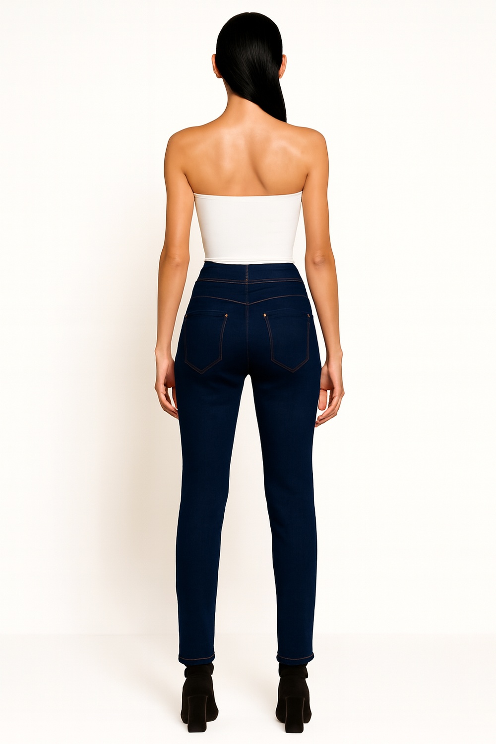 Jeans de tiro medio con pretina anatómica y cierre frontal, corte ajustado desde cadera hasta tobillo que define la silueta, confección en mezclilla con elasticidad para mayor confort, bolsillos funcionales delanteros y traseros, largo completo con ajuste preciso