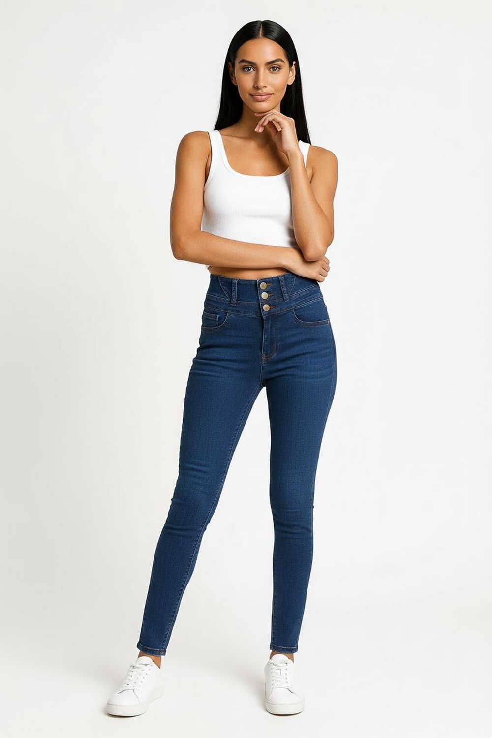 Jeans de tiro alto con pretina amplia y doble pespunte inclinado que realza la cintura, cierre frontal con botones metálicos funcionales que aseguran firmeza, corte skinny que se ajusta desde cadera hasta tobillo, bolsillos posteriores de diseño estructurado que aportan soporte visual, confección en mezclilla con elasticidad que brinda comodidad y definición