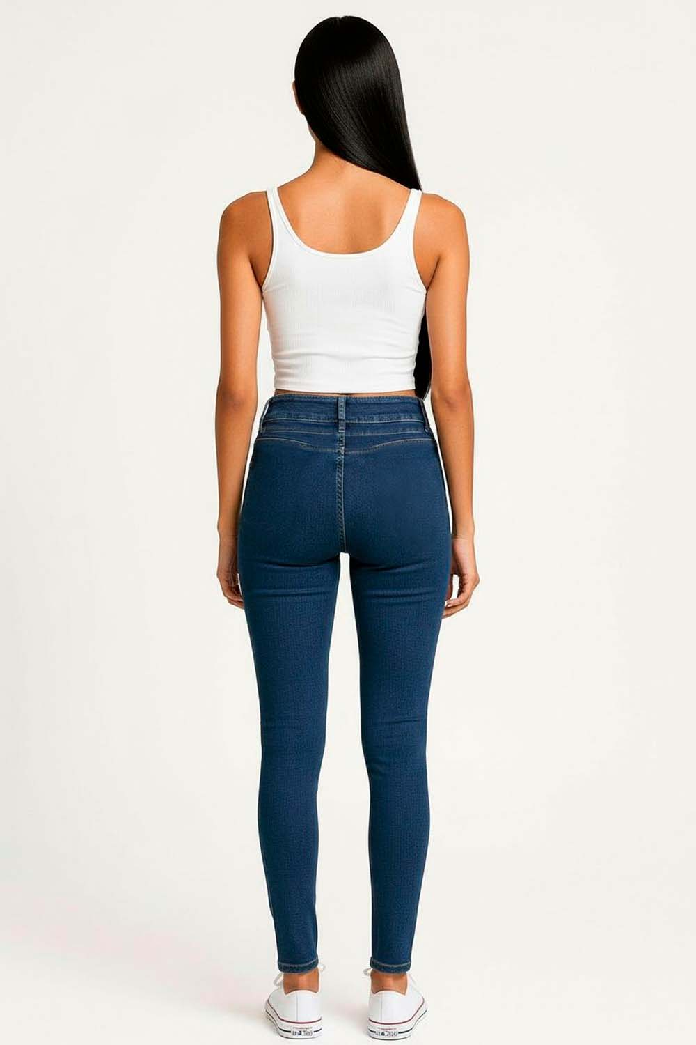 Jeans de tiro medio con silueta ajustada que define las piernas, cierre frontal con botonadura visible funcional, pretina firme que brinda sujeción, bolsillos traseros aplicados, largo al tobillo con caída recta que estiliza el conjunto