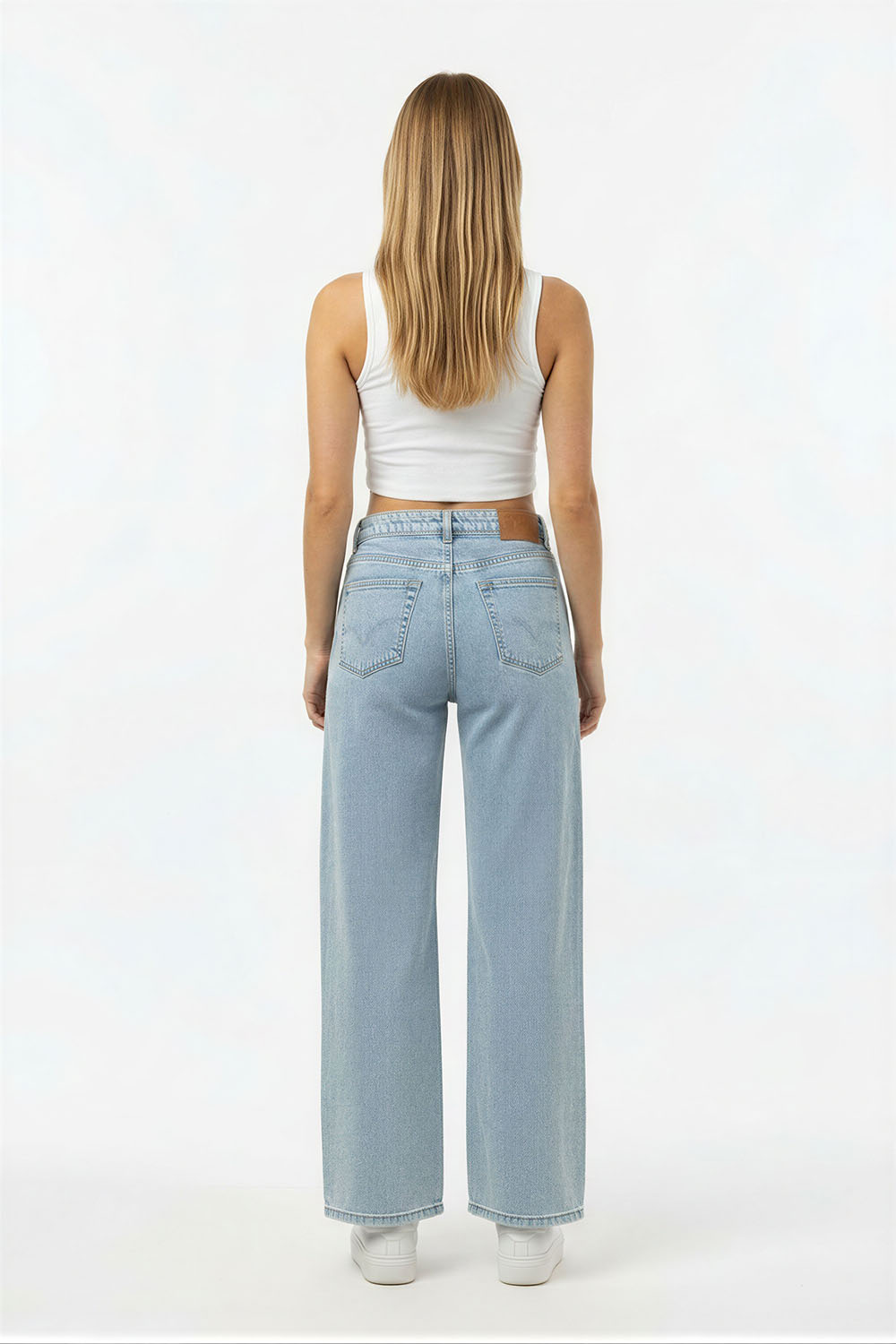 Jeans de tiro medio con cierre frontal y botón metálico, diseño wide leg con apertura gradual en pierna que aporta amplitud equilibrada, confección en mezclilla resistente con ligera elasticidad, estructura de cinco bolsas funcionales y presillas para cinturón, acabado deshilado en bajo que añade detalle actual al diseño