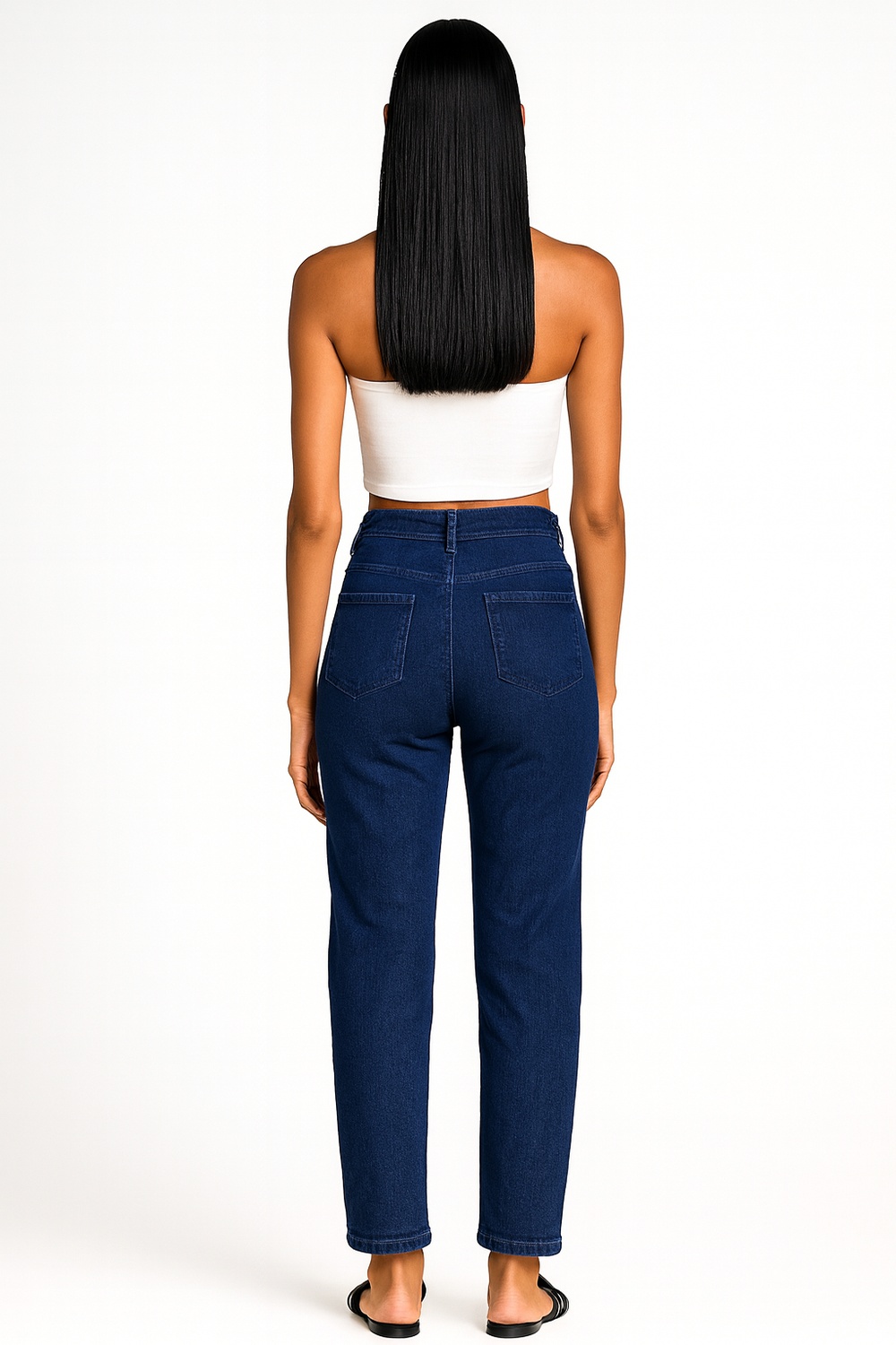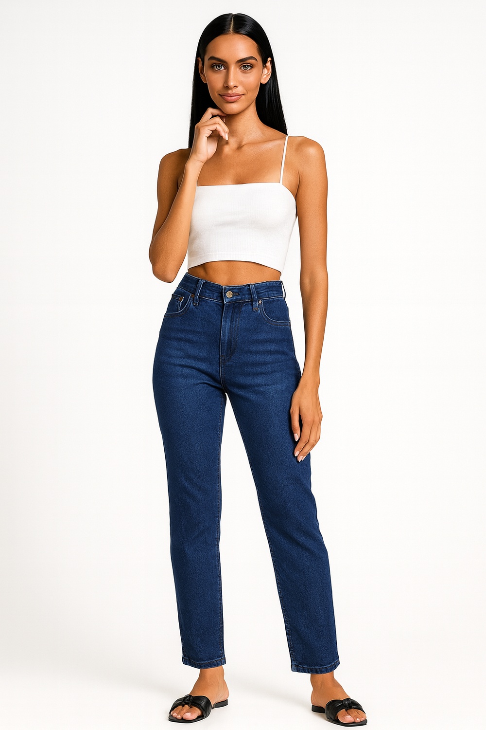 Pantalón de mezclilla con tiro alto y pretina firme que moldea la zona media, corte recto ligeramente ajustado que equilibra la silueta, diseño de cinco bolsas funcionales con acabado clásico, cierre frontal con botón y cremallera que asegura ajuste preciso, tejido resistente con elasticidad que permite libertad de movimiento
