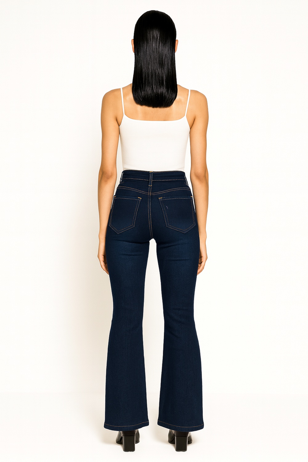 Jeans de tiro medio con pretina estructurada y cierre frontal, corte ajustado en cadera y muslo que se amplía gradualmente hacia el bajo, confección en mezclilla con elasticidad moderada para mayor comodidad, bolsillos funcionales delanteros y traseros, largo completo que estiliza la pierna