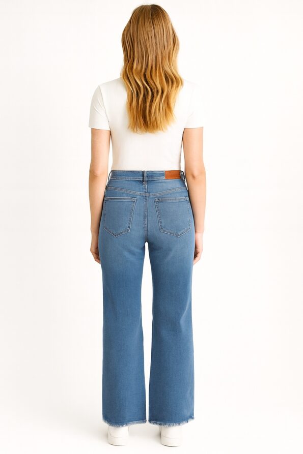 Jeans de tiro alto con corte wide leg que aporta un efecto visual alargado, diseño clásico de cinco bolsas que ofrece funcionalidad y estilo, confeccionados en mezclilla resistente con acabado suave al tacto, bastilla deshilada que añade un toque moderno