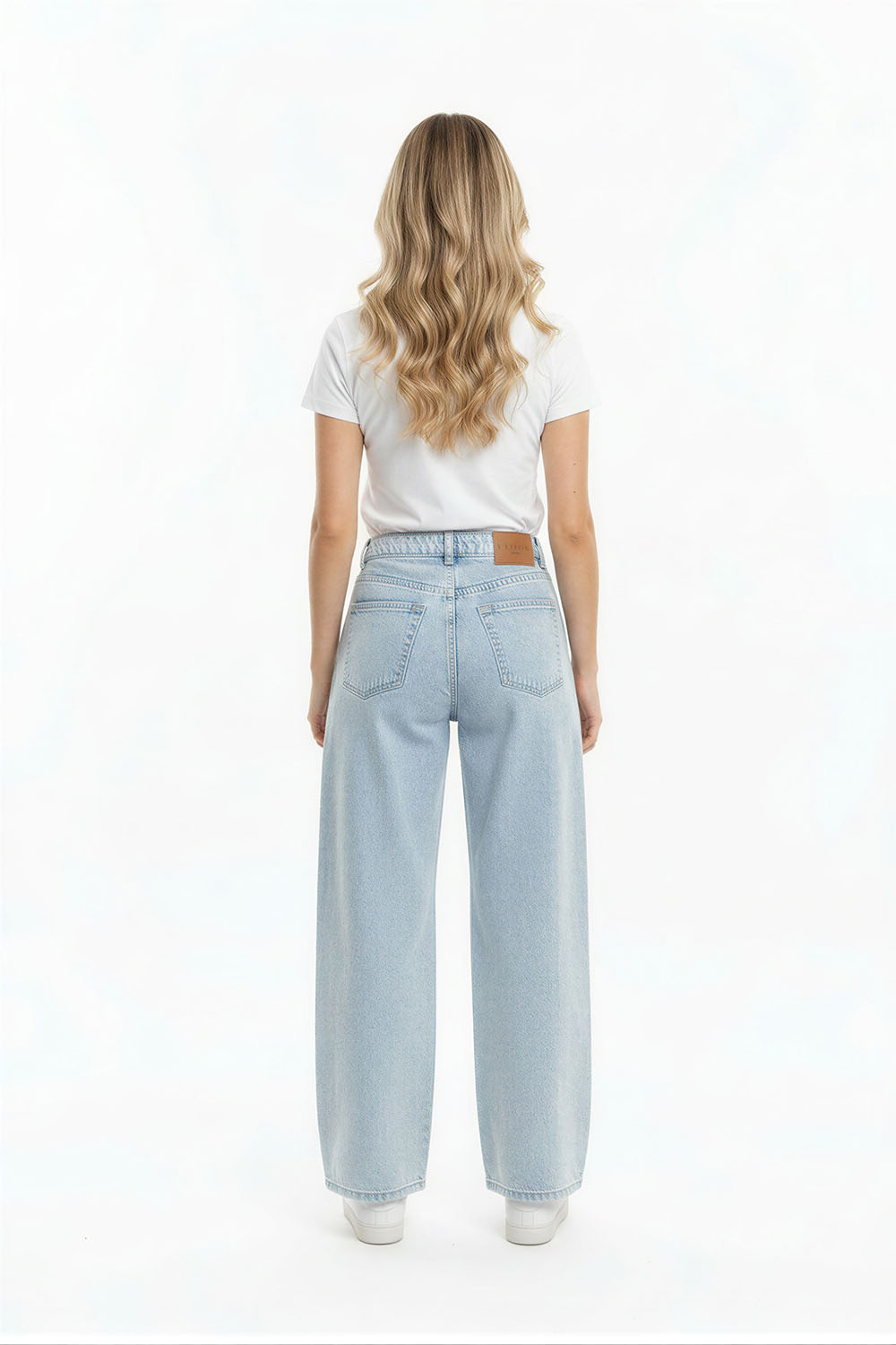 Jeans de tiro alto con corte wide leg que aporta amplitud y comodidad, diseño con pretina firme y cierre frontal que brinda ajuste seguro, estructura rígida que mantiene la forma de la prenda, largo completo que estiliza la figura y permite versatilidad en uso diario
