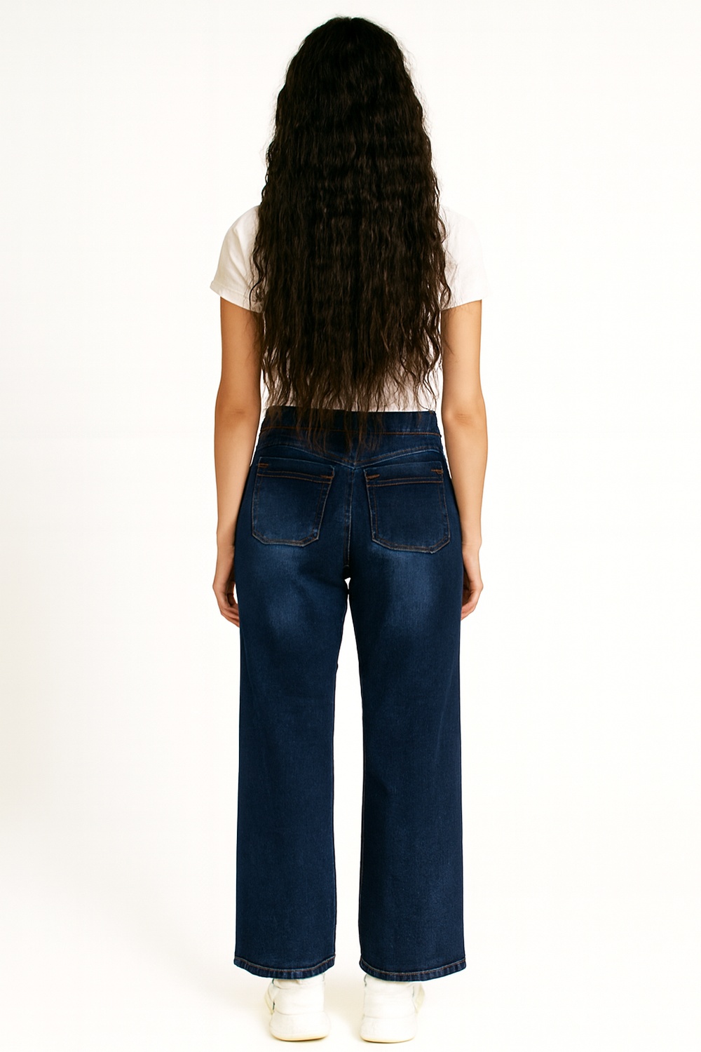 Jeans de mezclilla stretch con pretina ancha y cierre de botones metálicos frontales, corte acampanado que equilibra la figura, bolsillos funcionales y costuras que definen el contorno, tejido elástico que brinda comodidad y libertad de movimiento