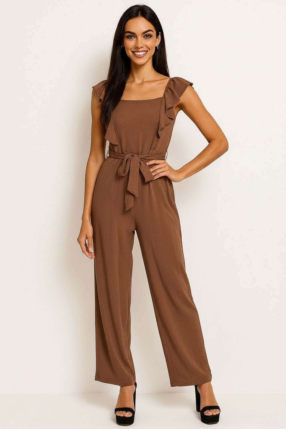 Jumper de tirante ancho, escote recto, ajuste en cintura con cinturón del mismo material, pierna amplia de caída recta, confección ligera con movimiento fluido