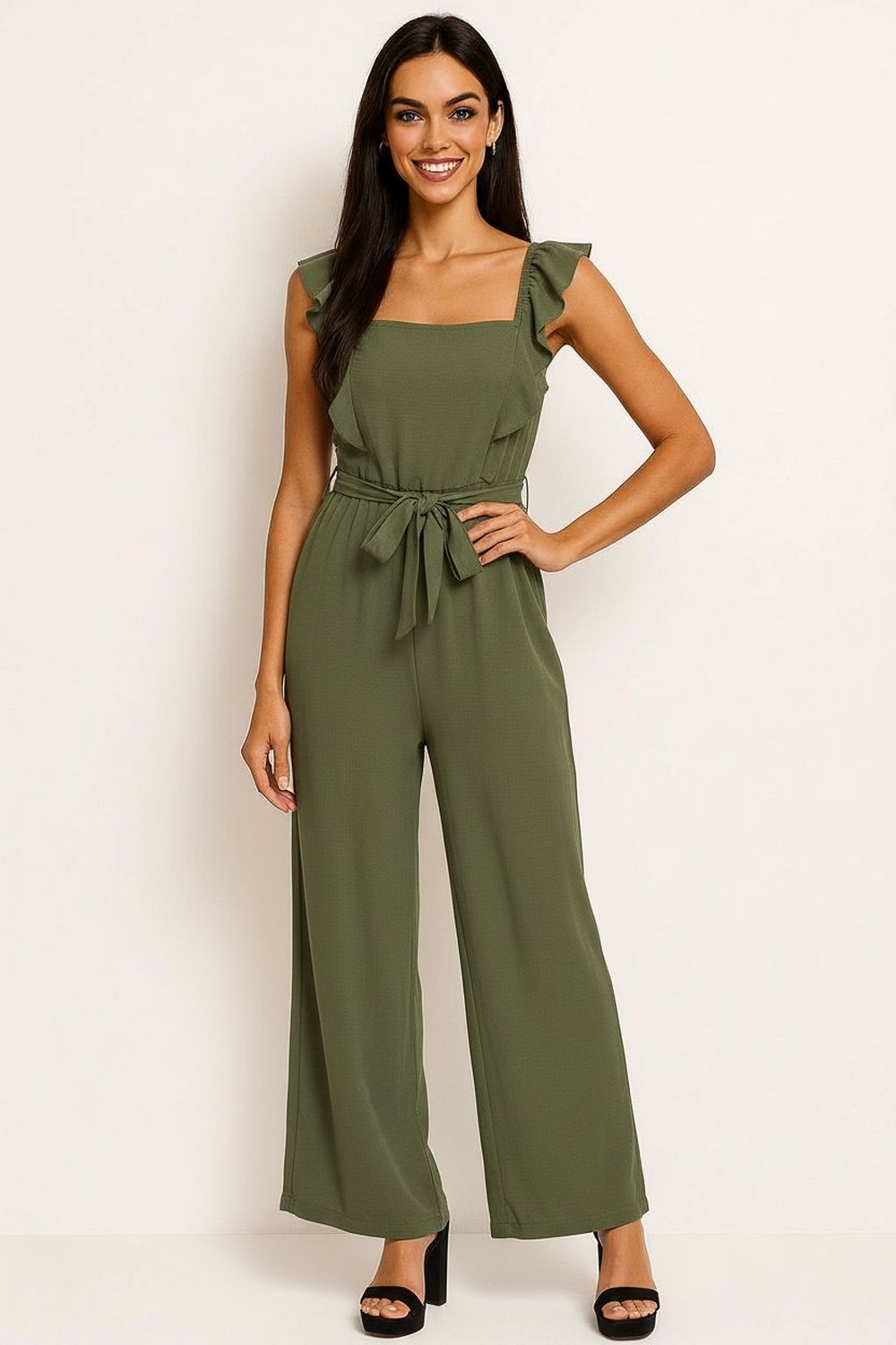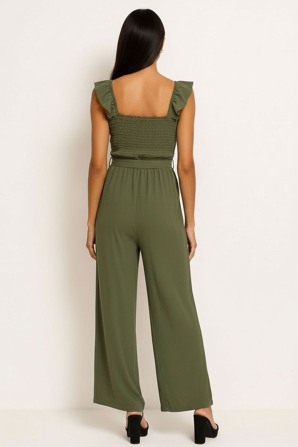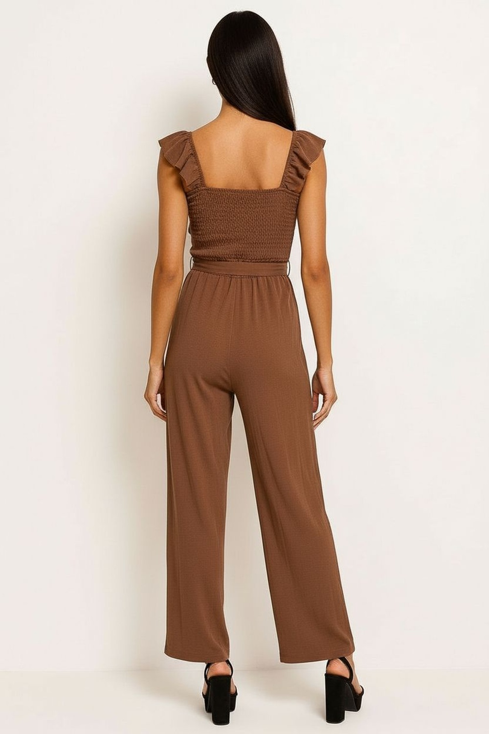 Palazzo de tirantes delgados con escote en V estructurado que estiliza la parte superior, cinturón integrado del mismo tejido que permite ajustar la cintura, pierna amplia de largo completo que aporta caída elegante y movimiento, confección en tela ligera de textura suave que ofrece frescura y comodidad prolongada