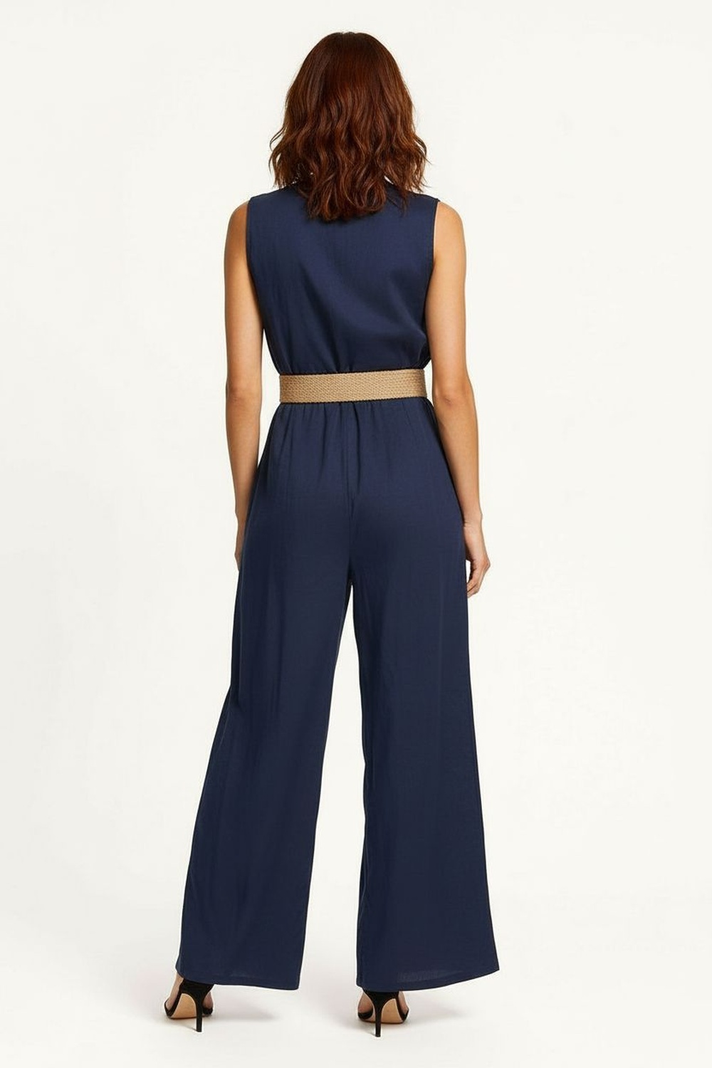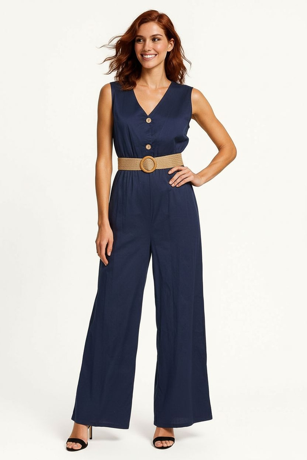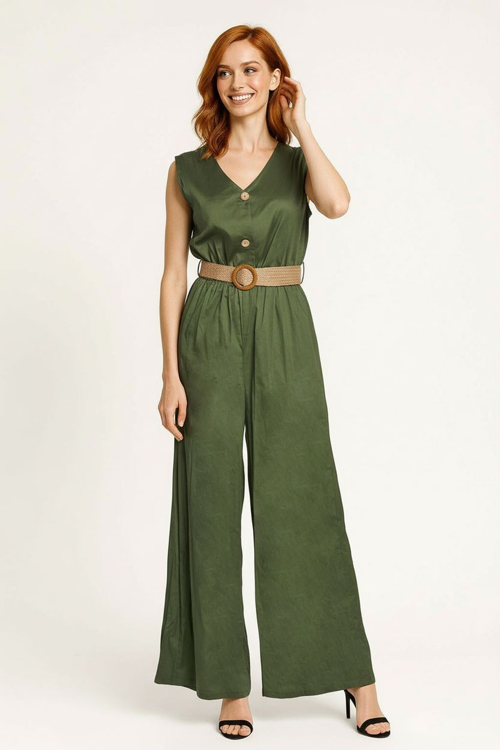 Jumpsuit de corte palazzo con escote en V y botonadura frontal decorativa, diseño sin mangas que libera el hombro y estiliza el torso, cintura definida con cinturón integrado que aporta balance visual, pierna amplia de largo completo que alarga la figura, confección fluida con caída uniforme y ajuste cómodo