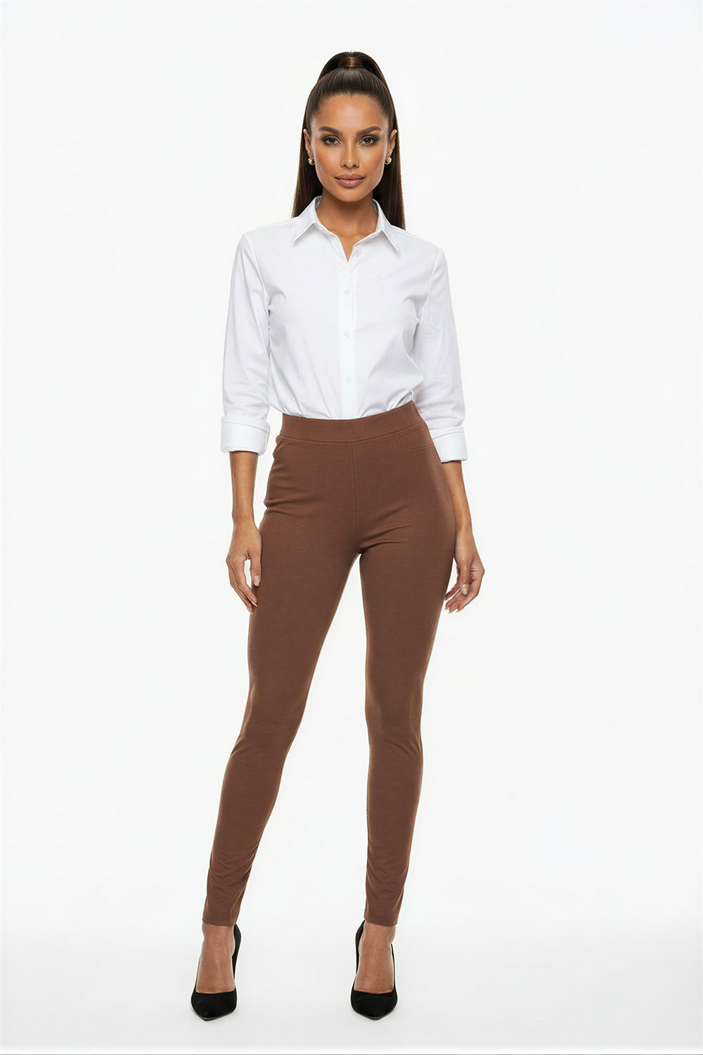 Leggings de tiro alto con ajuste ceñido que define la silueta, pretina ancha que brinda soporte y comodidad al abdomen, diseño con simulación de bolsa que aporta detalle visual discreto, confección en tejido elástico que favorece la movilidad y adaptación al cuerpo, acabado liso que permite uso versátil en diferentes ocasiones