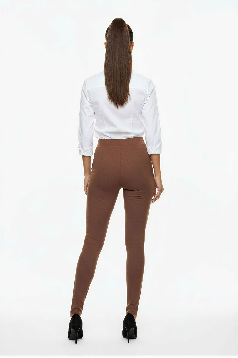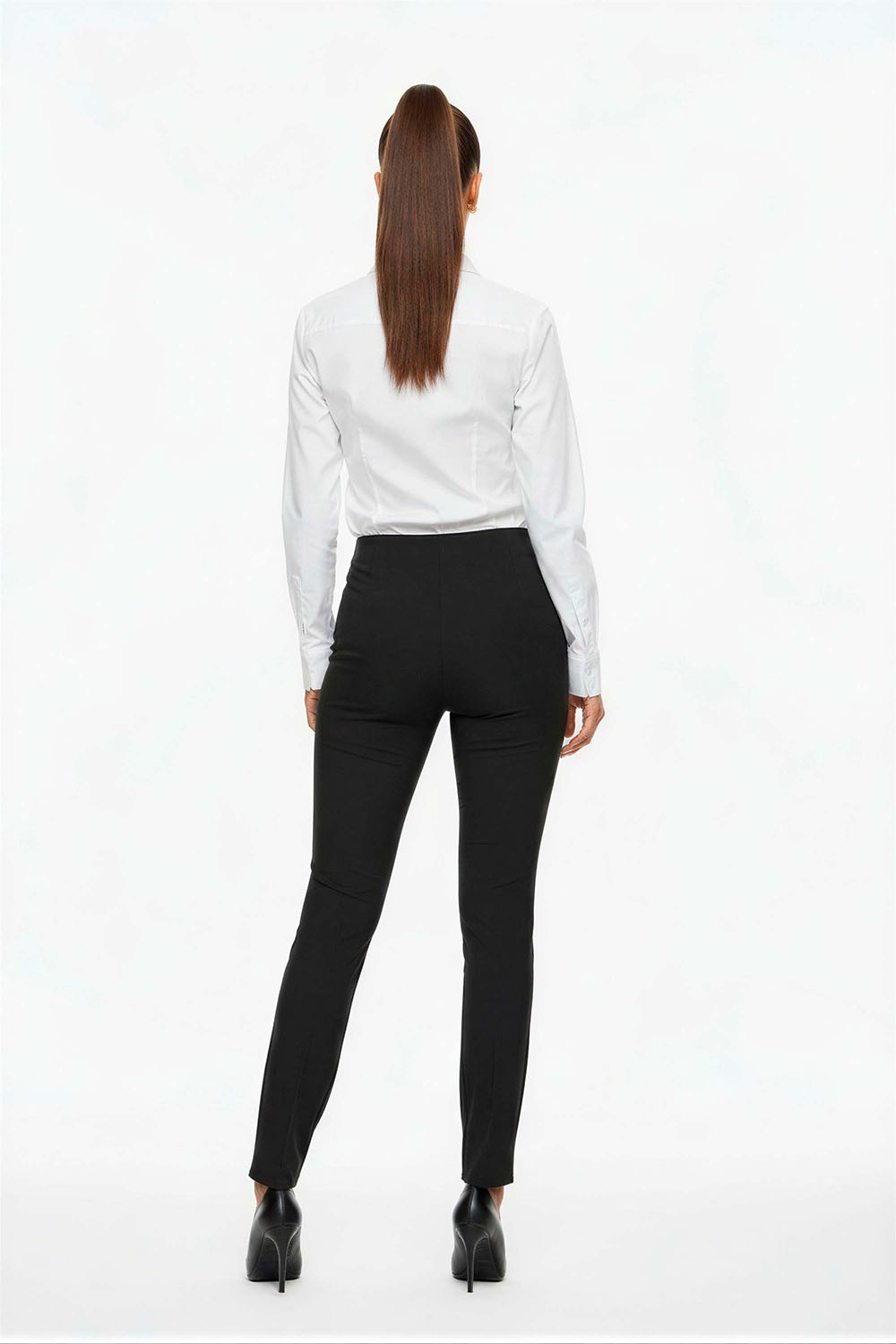 Pantalón de silueta ajustada, tiro medio, cierre frontal con botón, trabillas para cinturón, bolsillos laterales y traseros, corte estilizado que define la figura