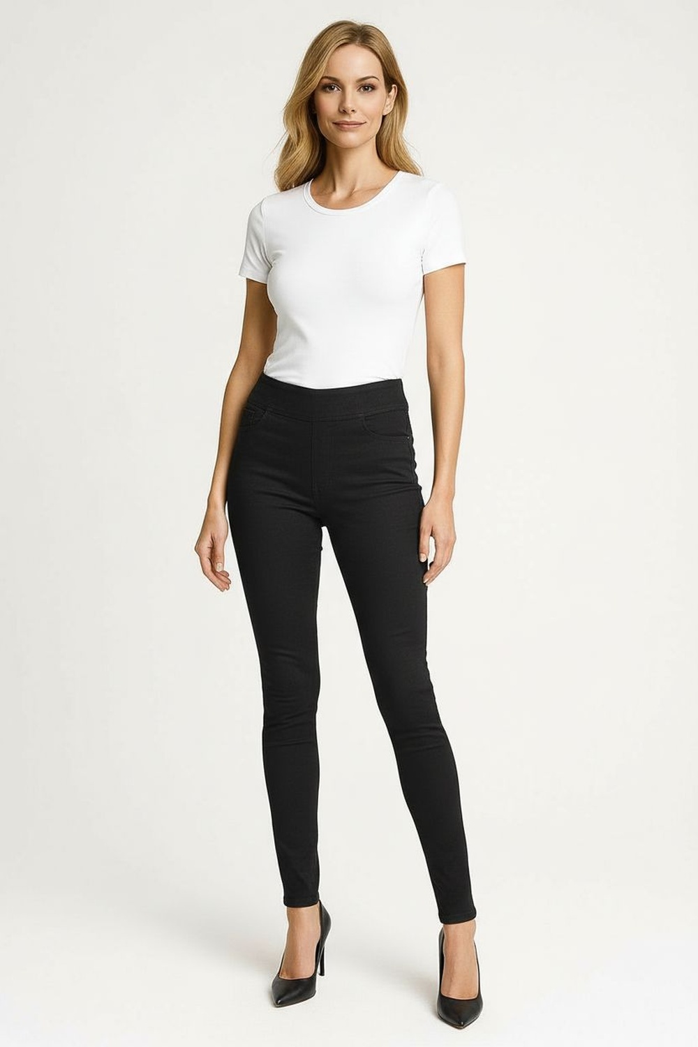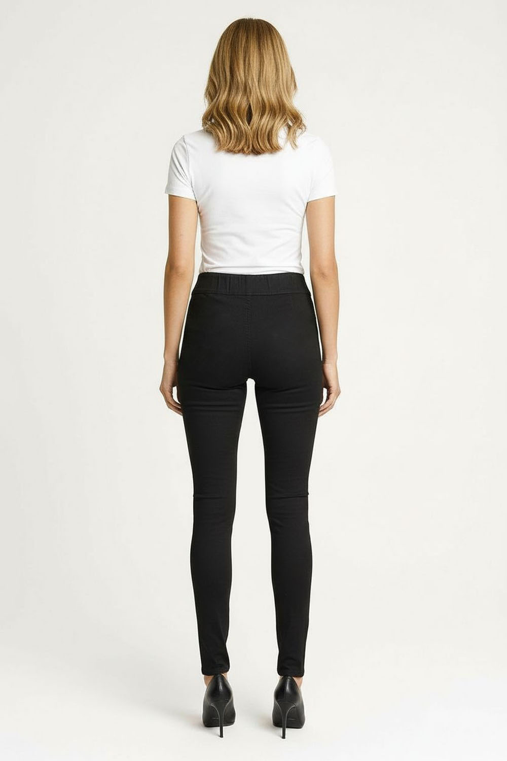 Pantalón de tiro medio con pretina ancha y botonadura frontal visible que define la cintura, corte pitillo ajustado desde cadera hasta tobillo que estiliza la silueta, diseño con bolsas traseras funcionales que aportan estructura, confección en mezclilla stretch que brinda comodidad y libertad de movimiento, acabado limpio en bajo con ajuste ceñido