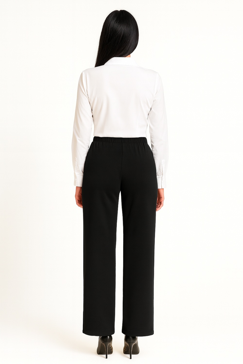 Pantalón con estructura slim fit y diseño de cintura alta, cinturilla con detalle decorativo que simula cinto metálico, bolsillos laterales y posteriores falsos que aportan estilo sin volumen, pretina elástica para mayor ajuste y confort, tela suave y ligeramente stretch en tono negro ideal para looks de oficina