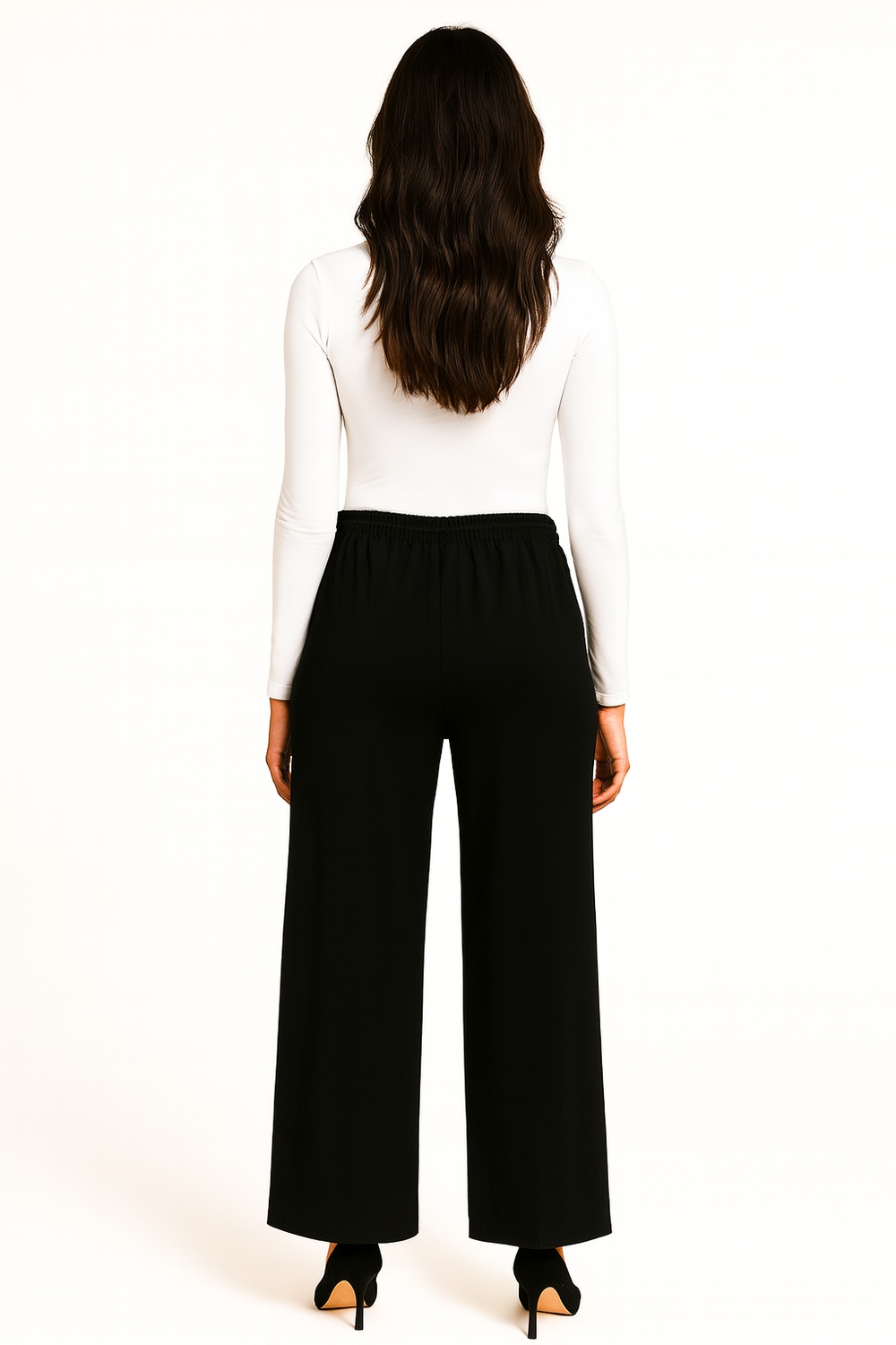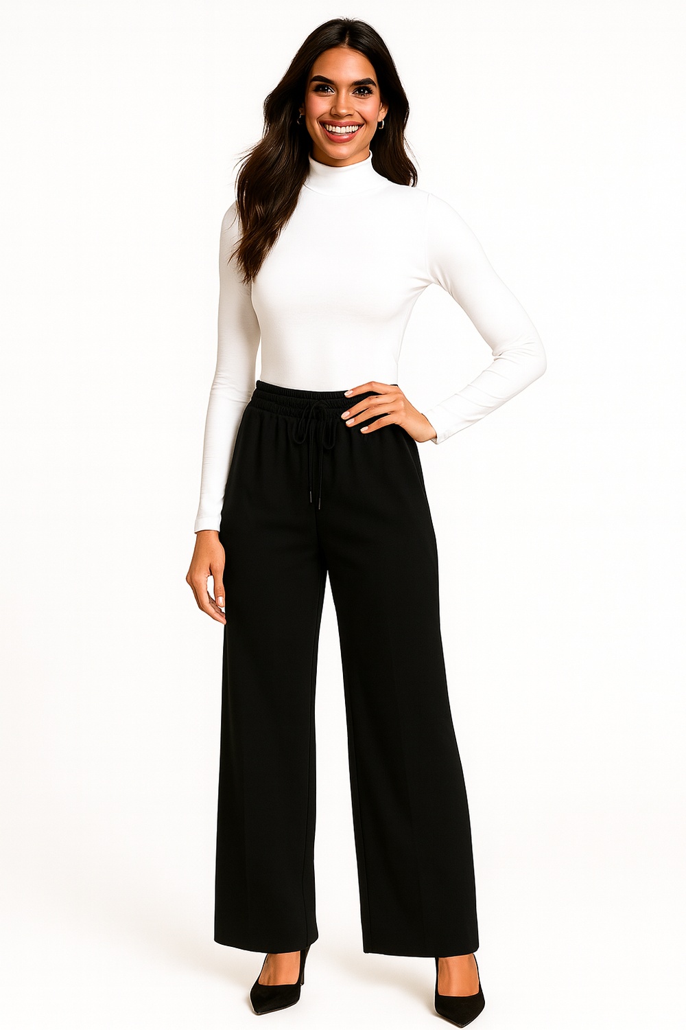 Pantalón de tiro alto con pinzas frontales que aportan estructura y elegancia, pretina con trabillas y cierre frontal con botón que aseguran un ajuste firme, bolsillos laterales funcionales que añaden practicidad, corte amplio que ofrece comodidad y libertad de movimiento, confeccionado en tejido suave con caída natural ideal para looks casuales o formales