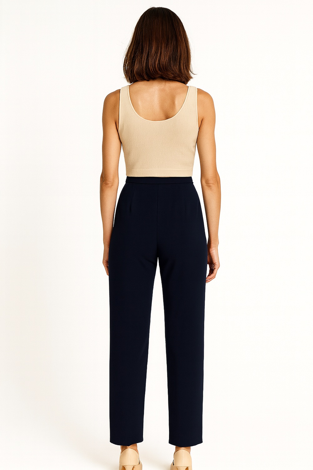Pantalón de tiro alto con pretina dividida que define la cintura, cierre frontal con doble botón y cremallera que brindan ajuste firme, bolsillos laterales funcionales que aportan practicidad, corte recto con terminación ajustada al tobillo, confeccionado en tejido elástico que combina comodidad, estructura y estilo