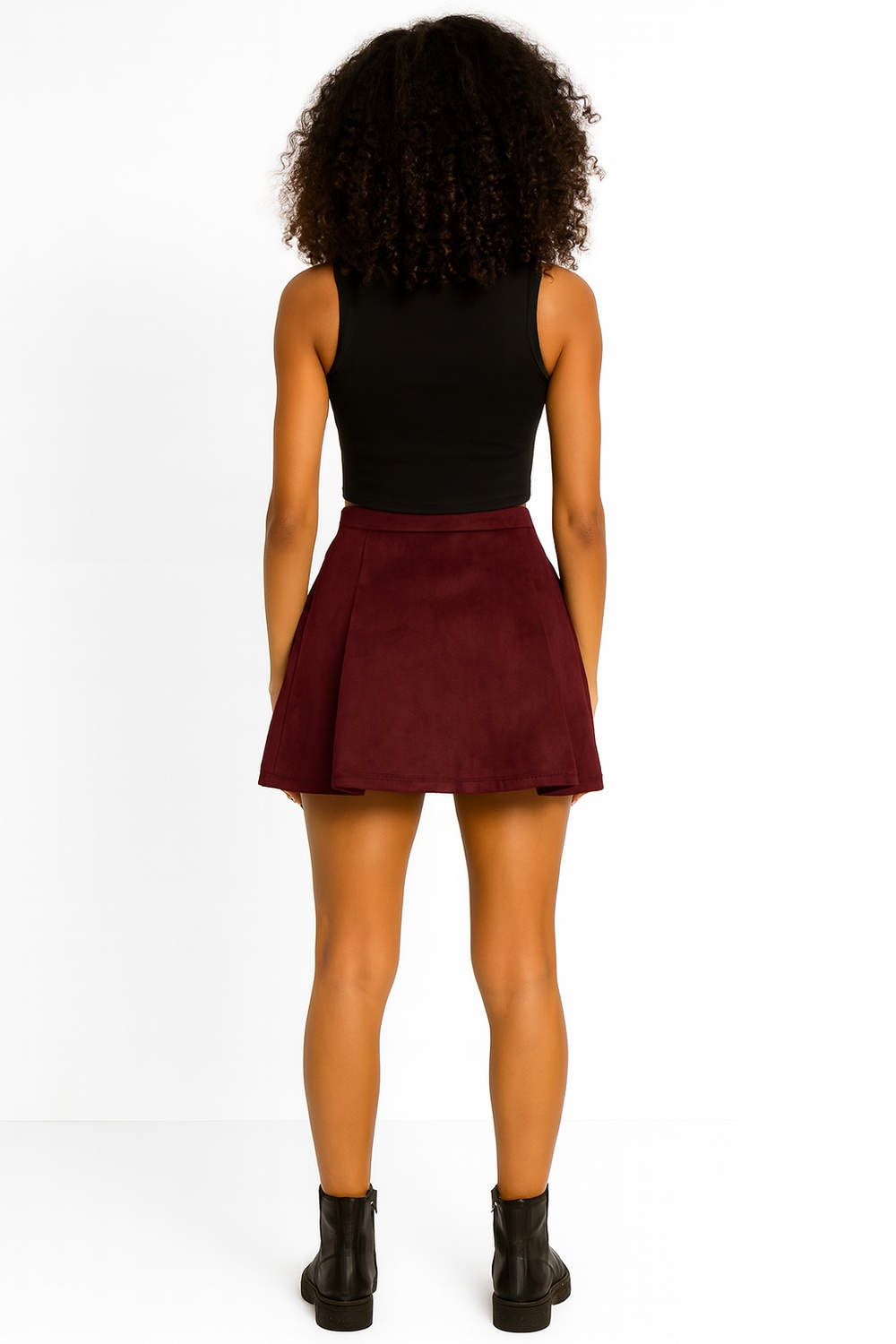 Minifalda de tiro alto con pretina ajustada que brinda soporte y comodidad, diseño con tablones marcados que aportan movimiento y estilo juvenil, detalle de hebillas metálicas laterales que realzan el diseño moderno, confección en tejido tipo gamuza suave que ofrece un acabado elegante, ideal para outfits casuales y combinaciones versátiles de temporada