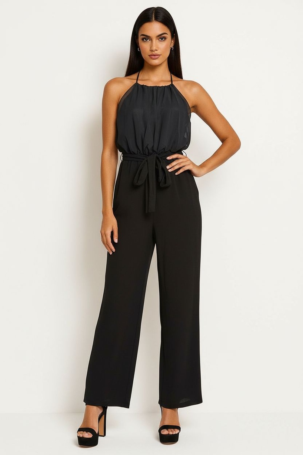Palazzo halter con escote alto y espalda descubierta con cierre posterior, parte superior con ligero plisado que aporta movimiento, cintura definida con lazo ajustable que estiliza la figura, pantalón tipo Palazzo de pierna amplia que brinda fluidez y caída elegante, confección en tela ligera de tacto suave que favorece comodidad prolongada