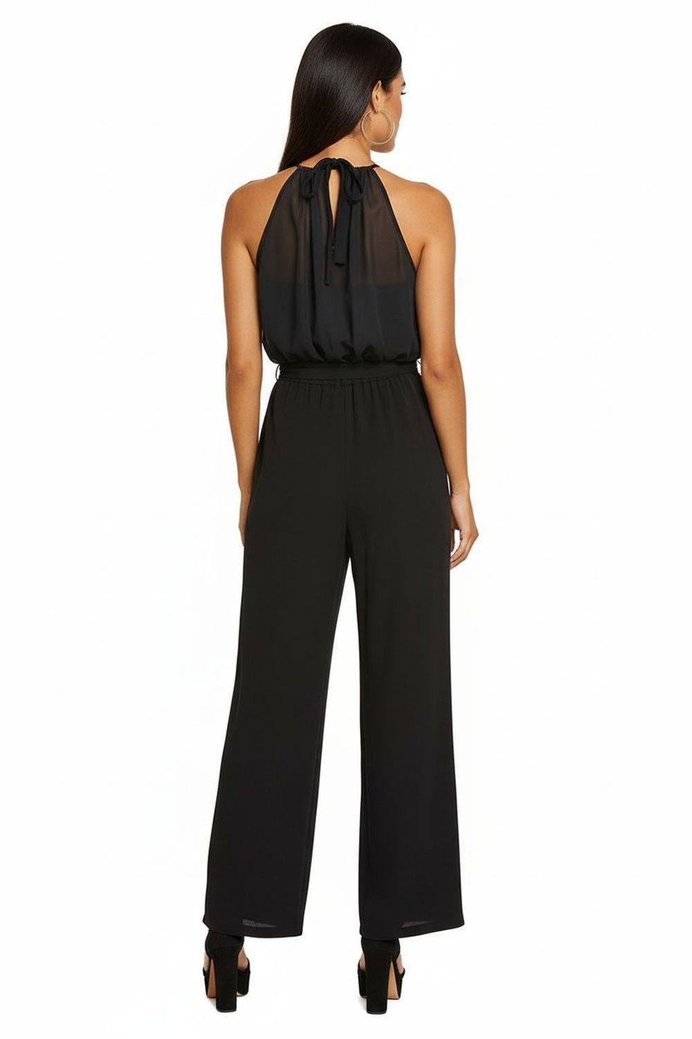 Palazzo de tirantes finos y escote recto, espalda descubierta con moño decorativo que aporta detalle distintivo, corte amplio en pierna que favorece la caída del tejido, confección fluida que aporta elegancia y comodidad al movimiento