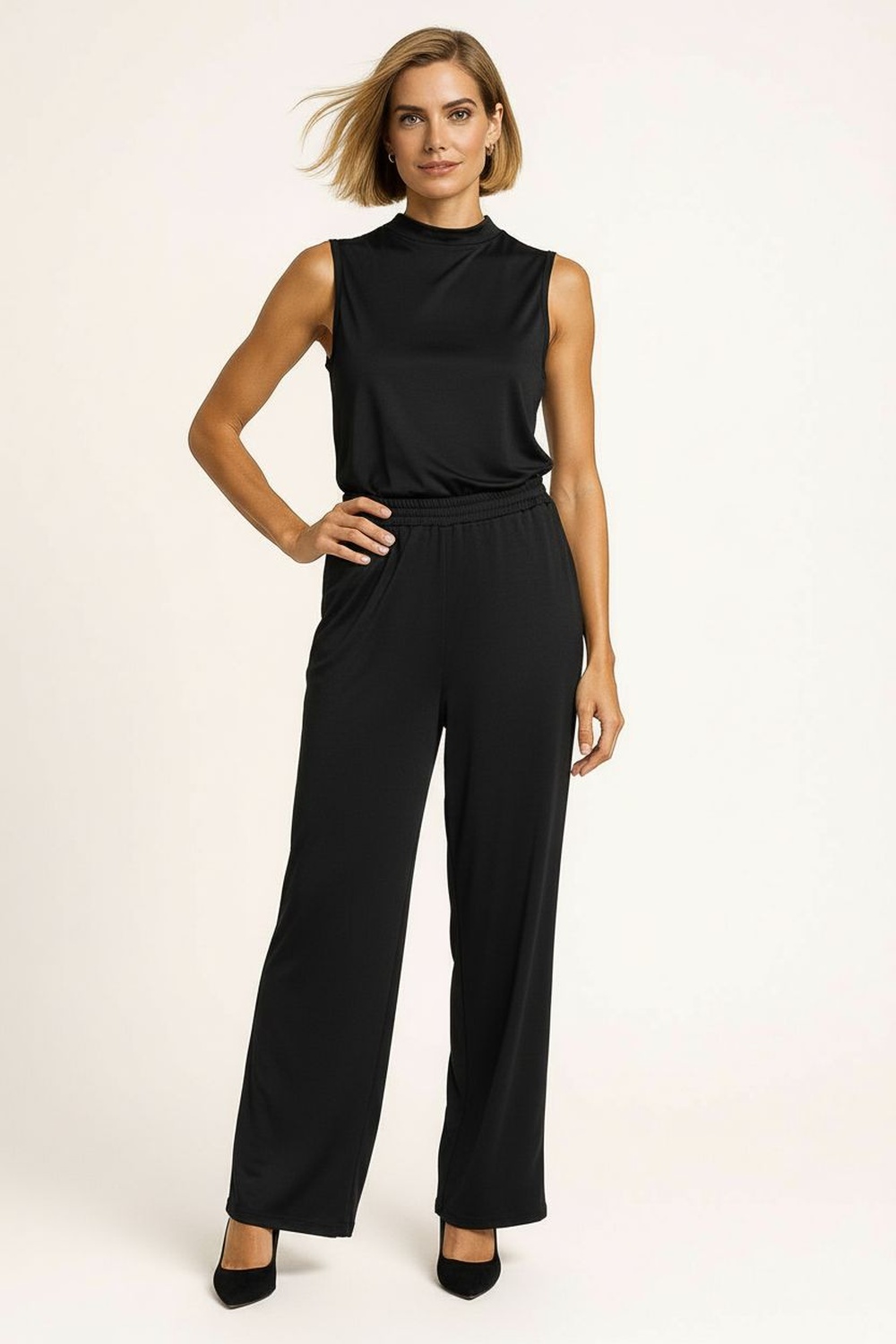 Palazzo sin mangas con cuello cerrado que aporta un look estilizado, pretina elástica que brinda comodidad y ajuste seguro en la cintura, silueta amplia de pierna recta que genera caída fluida y favorece la movilidad, confección en tejido suave que garantiza frescura y confort durante todo el día