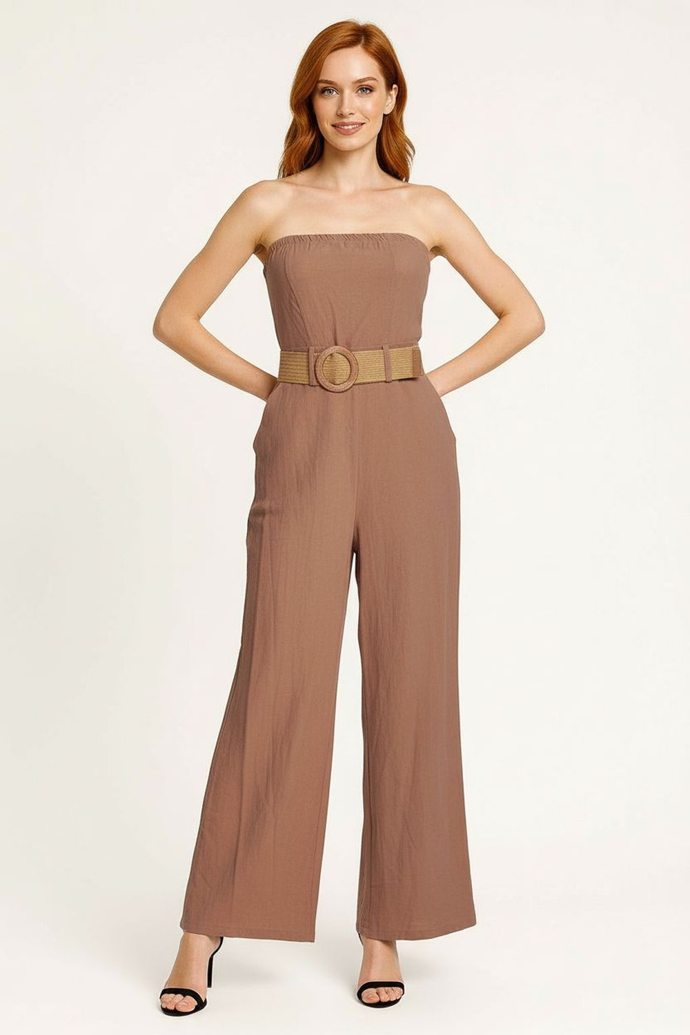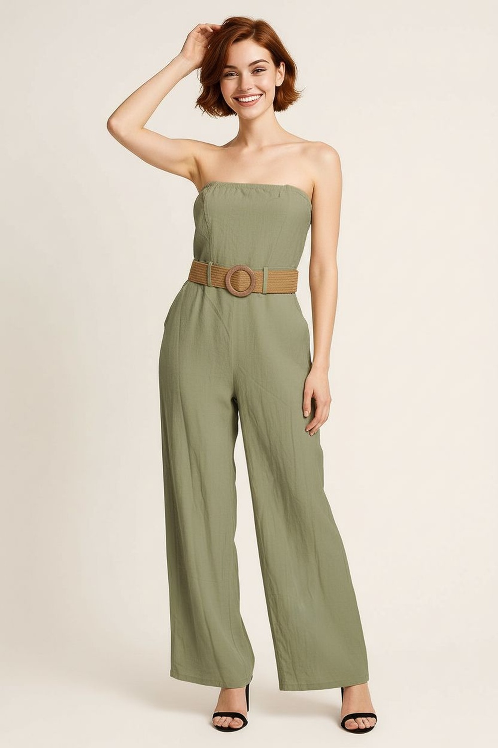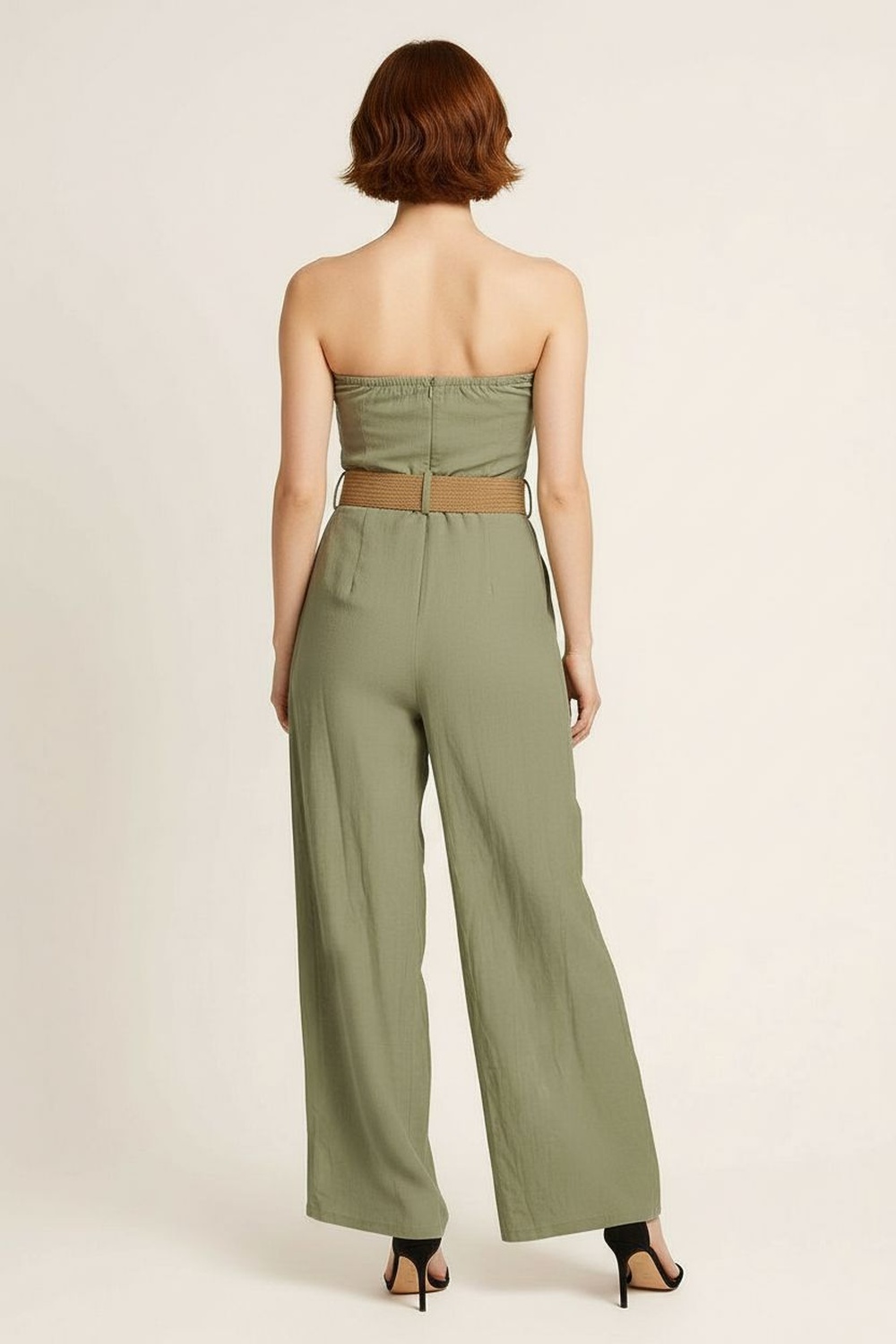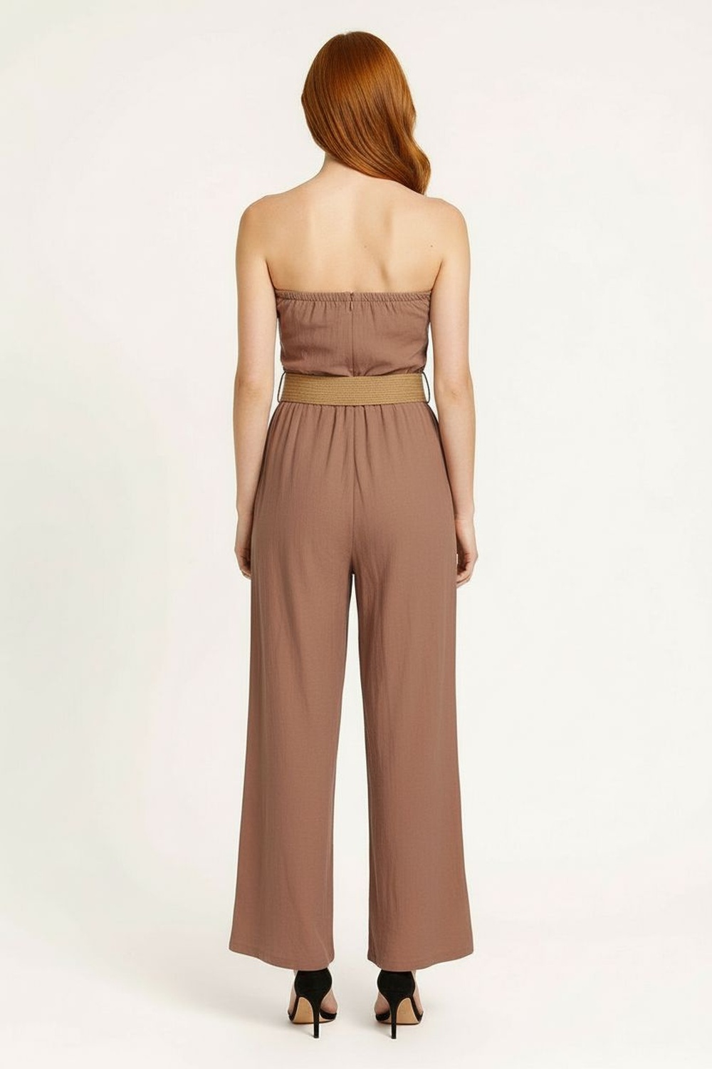 Palazzo sin tirantes con escote recto, ajuste superior elástico, cinturón integrado con hebilla decorativa, corte amplio en pierna, caída fluida, pretina definida, terminado limpio en orillas