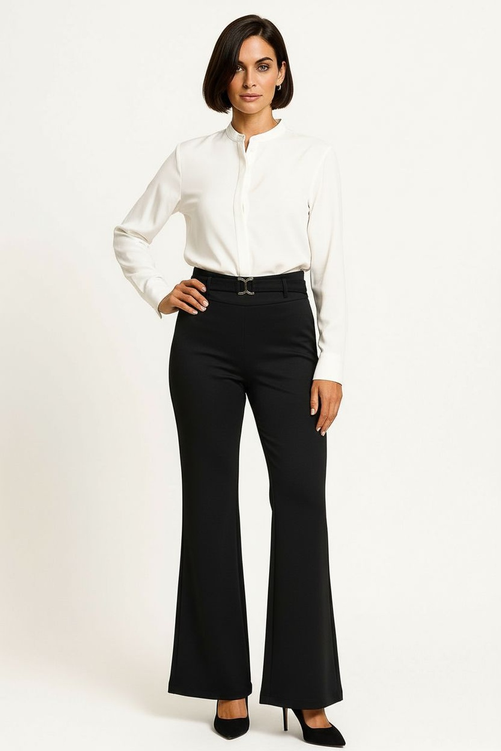Pantalón de tiro alto con silueta acampanada que equilibra la figura, cintura estructurada con hebilla decorativa integrada que aporta firmeza, largo completo que estiliza la línea de la pierna, confección en tejido con elasticidad moderada para mayor confort, terminación limpia en bajos