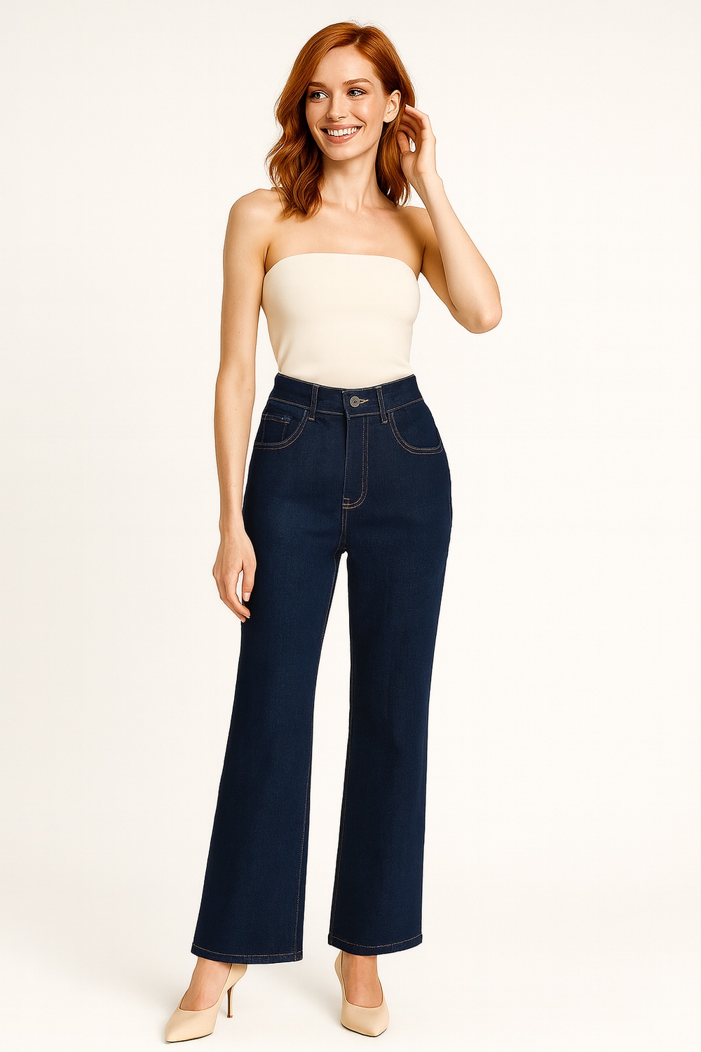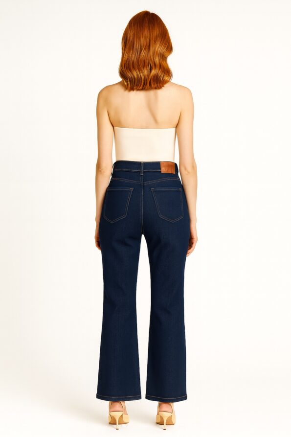 Pantalón de corte acampanado que estiliza la silueta y aporta un look moderno, talle alto con pretina ancha que asegura un ajuste firme y favorecedor, bolsillos delanteros y traseros funcionales que brindan practicidad, confección en mezclilla flexible que otorga comodidad y resistencia, dobladillo limpio que refuerza la estructura y mantiene la forma definida en cada uso