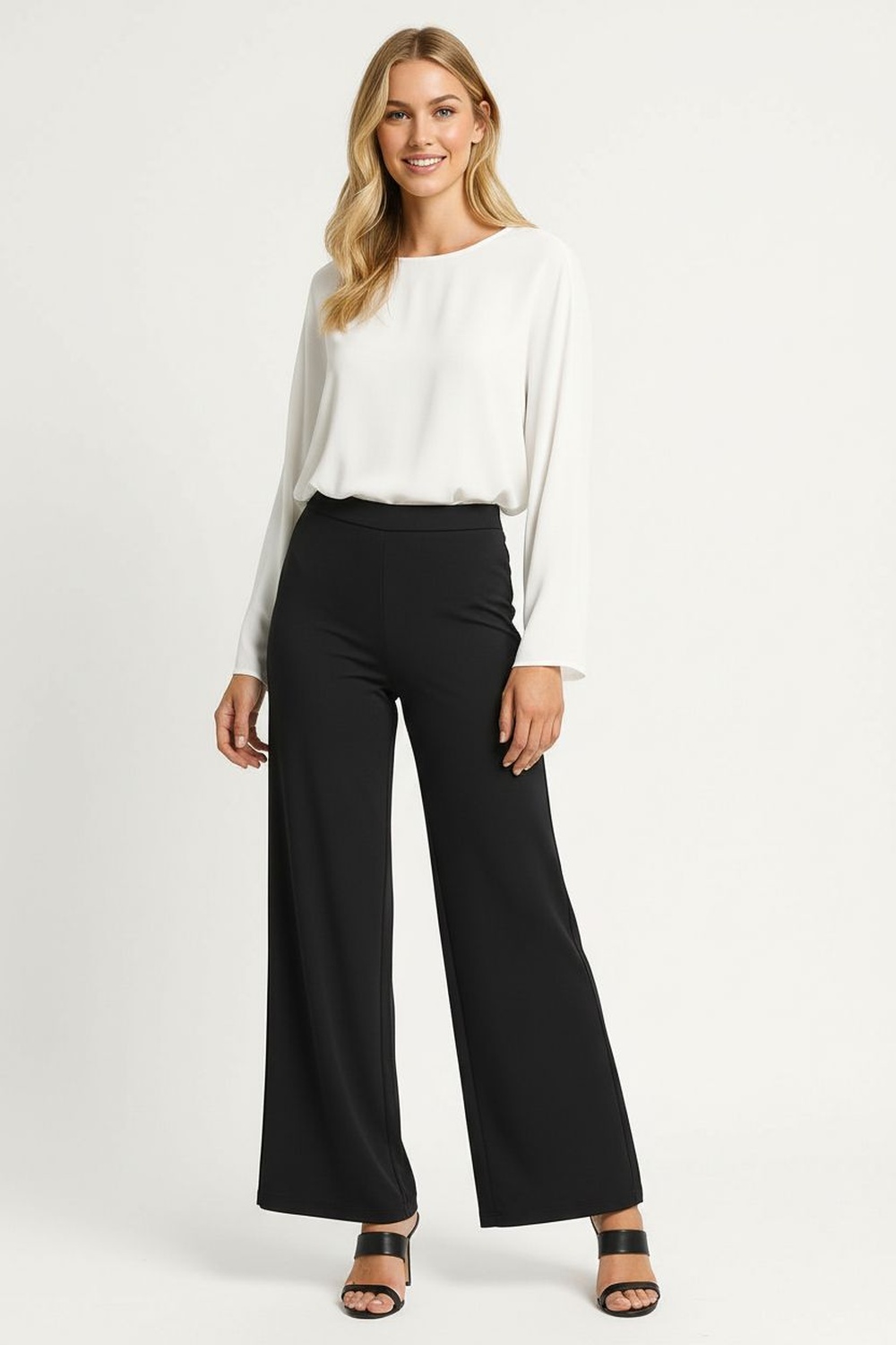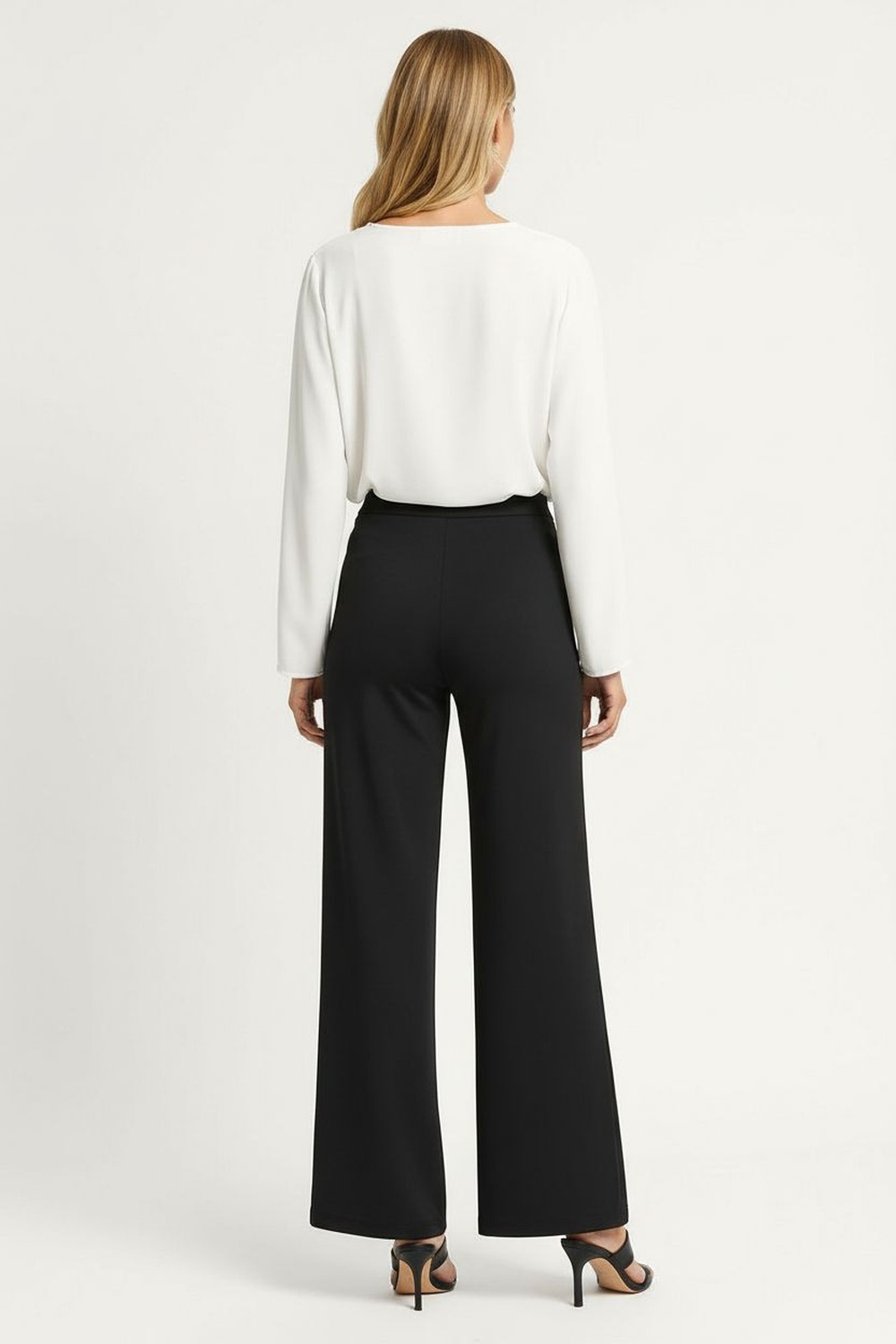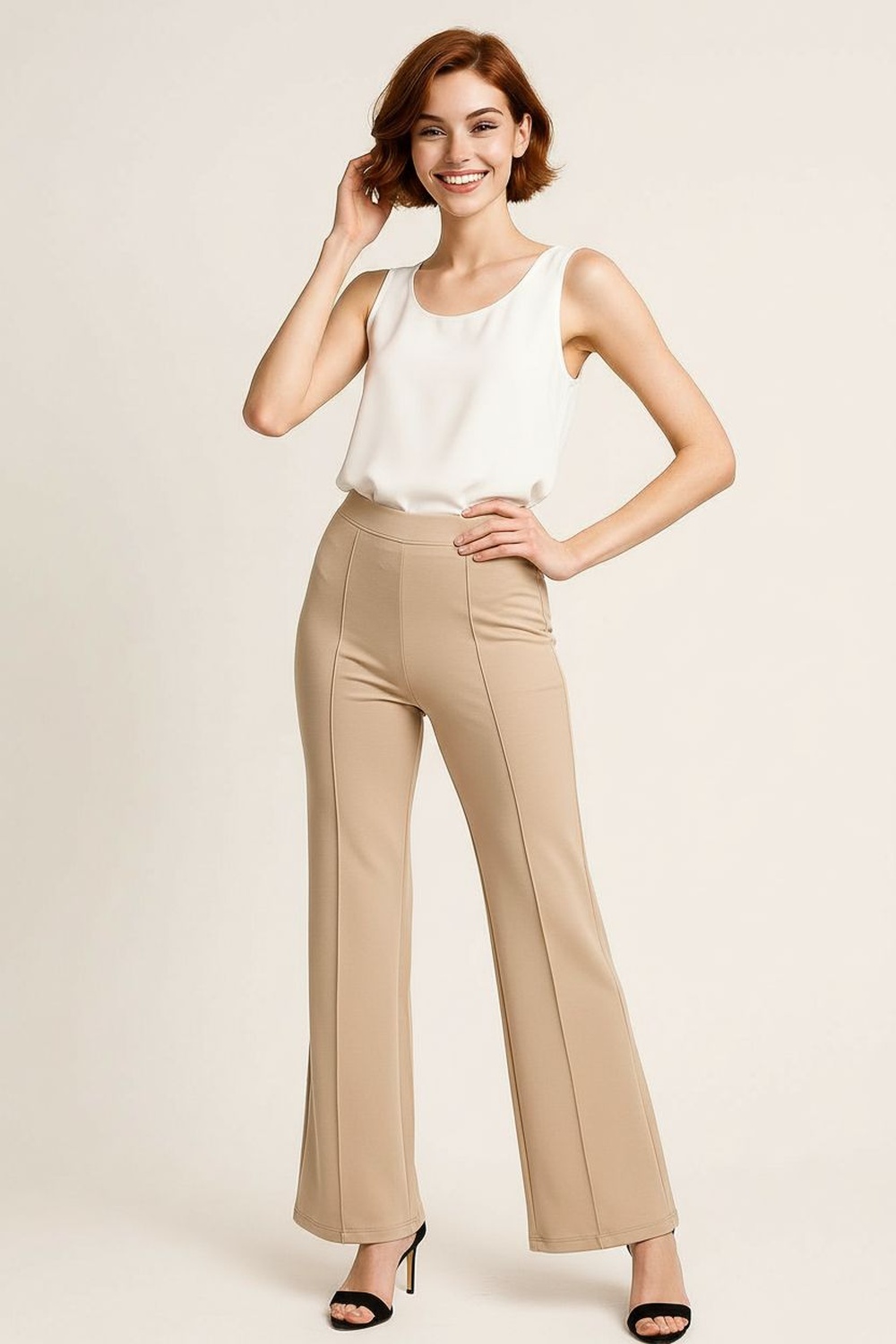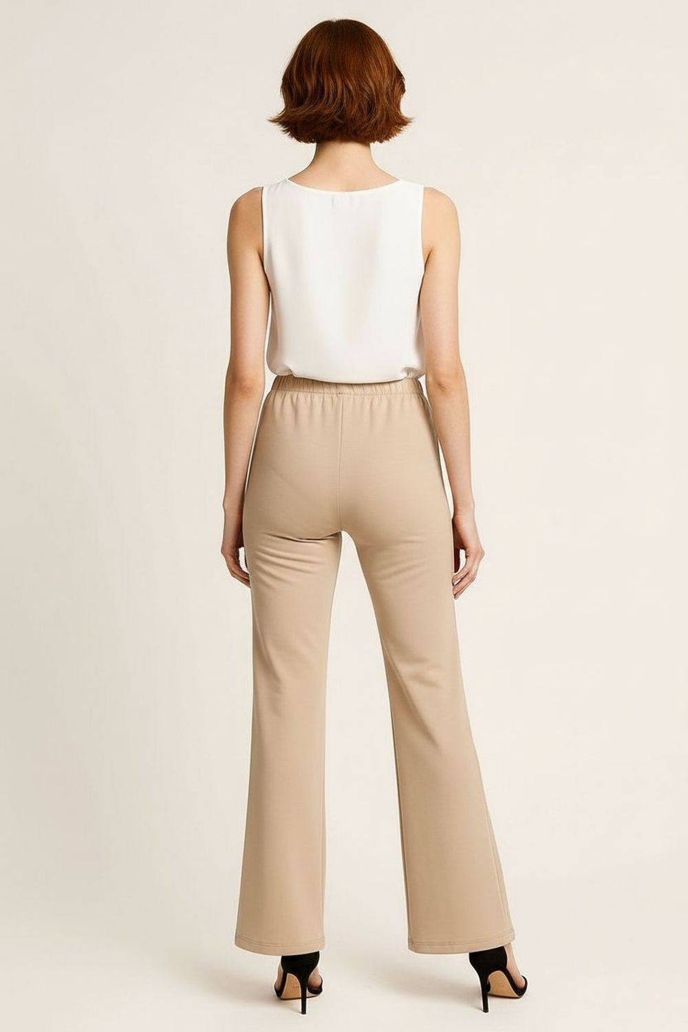 Pantalón de tiro alto, corte acampanado, pretina elástica, costuras visibles al frente, caída fluida, FIT REGULAR