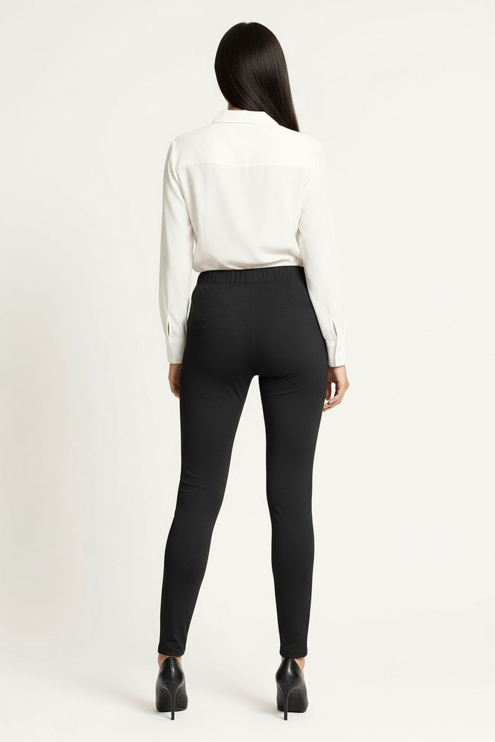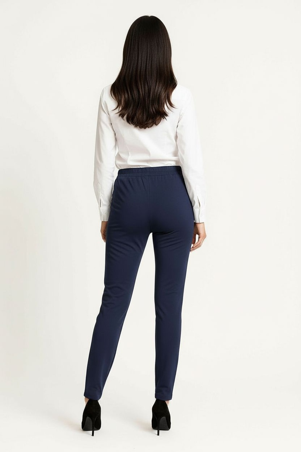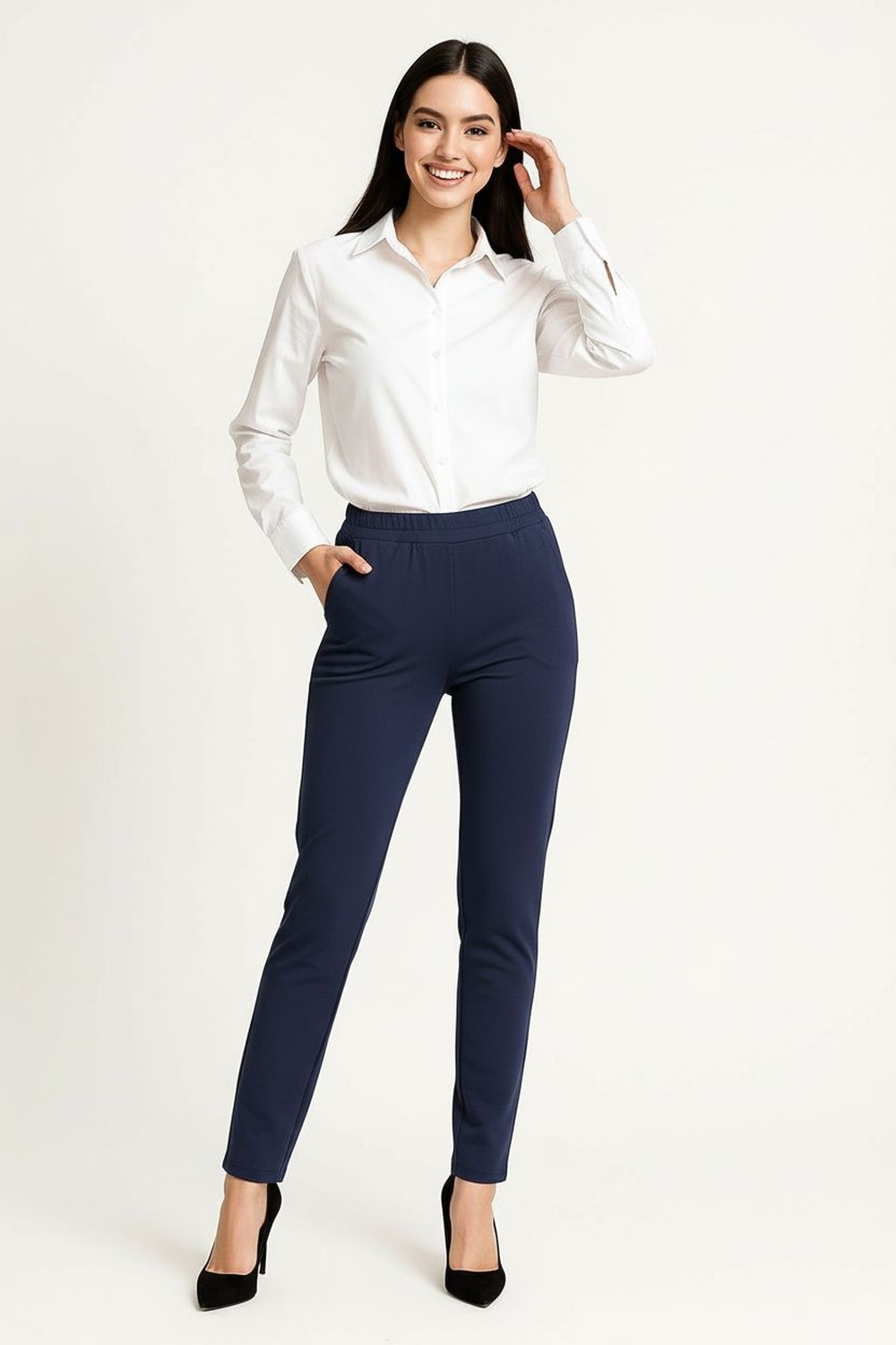 Pantalón de vestir con pretina amplia y detalle de pespunte decorativo que define la cintura, cierre frontal con botón que asegura ajuste práctico, corte recto de largo completo que estiliza la silueta, bolsillos funcionales que aportan utilidad diaria, confección firme que mantiene estructura y presencia formal