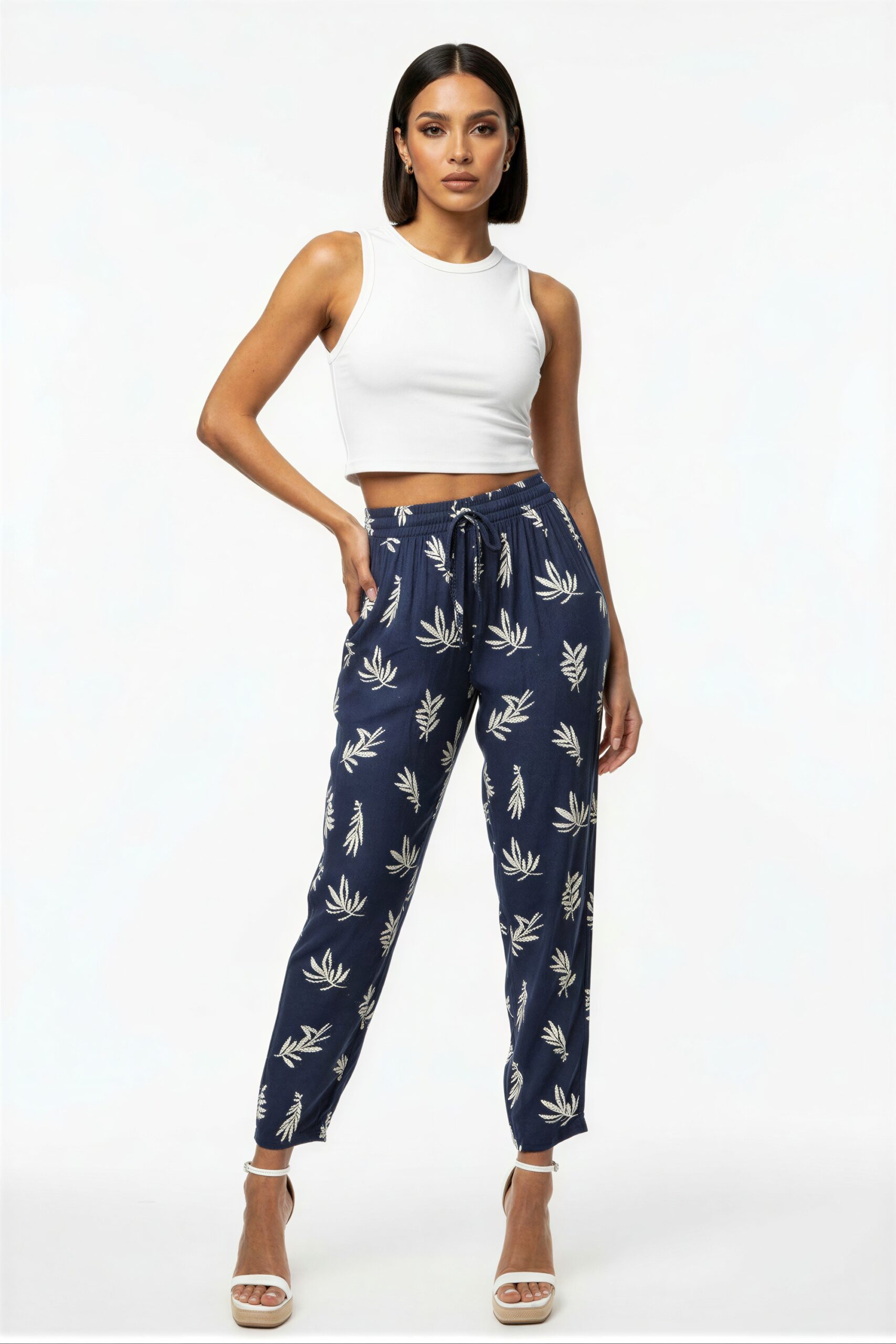 Pantalón de tiro medio con jareta ajustable que brinda sujeción personalizada, pretina elástica que asegura confort, pierna amplia que genera libertad de movimiento, bolsillos laterales funcionales, confección fresca que favorece actividades del día a día