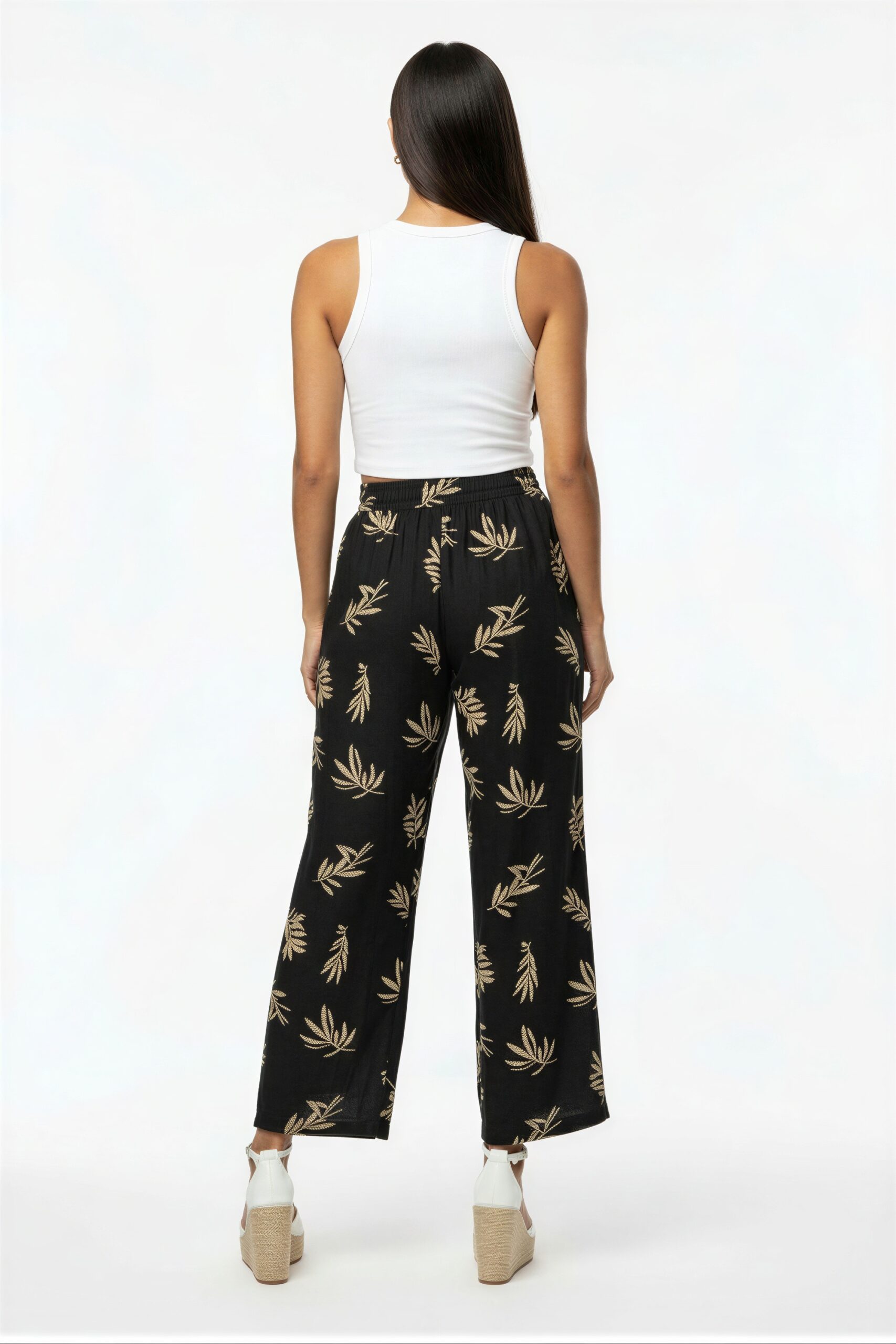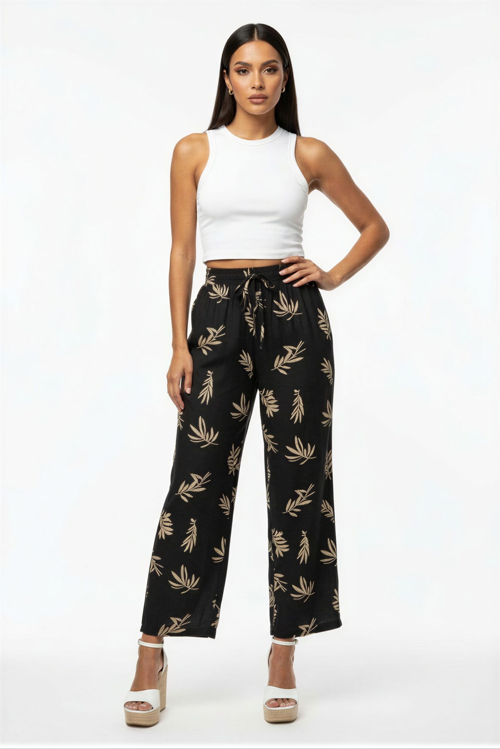 Pantalón de pierna amplia con tablón frontal que aporta caída fluida y mayor amplitud, tiro medio con pretina estructurada que brinda soporte cómodo, diseño de largo completo que estiliza visualmente, confección en tela ligera de movimiento suave que ofrece frescura, acabado limpio en bastilla que realza su presentación