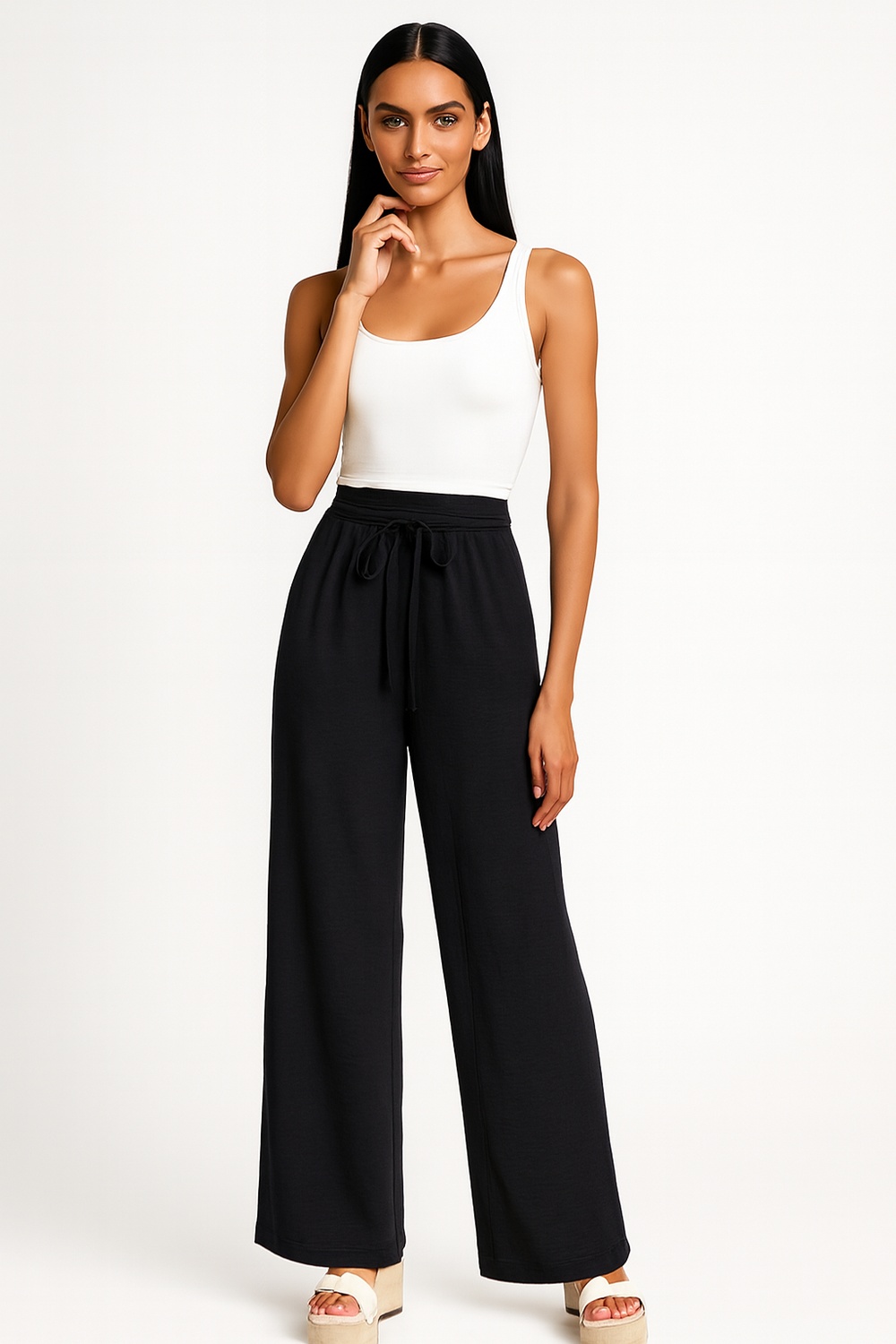 Pantalón de tiro alto con diseño envolvente y amarre frontal que permite ajuste personalizado, pierna amplia que brinda libertad de movimiento, pretina cómoda con ajuste seguro, confección en tejido ligero con caída fluida y sensación fresca