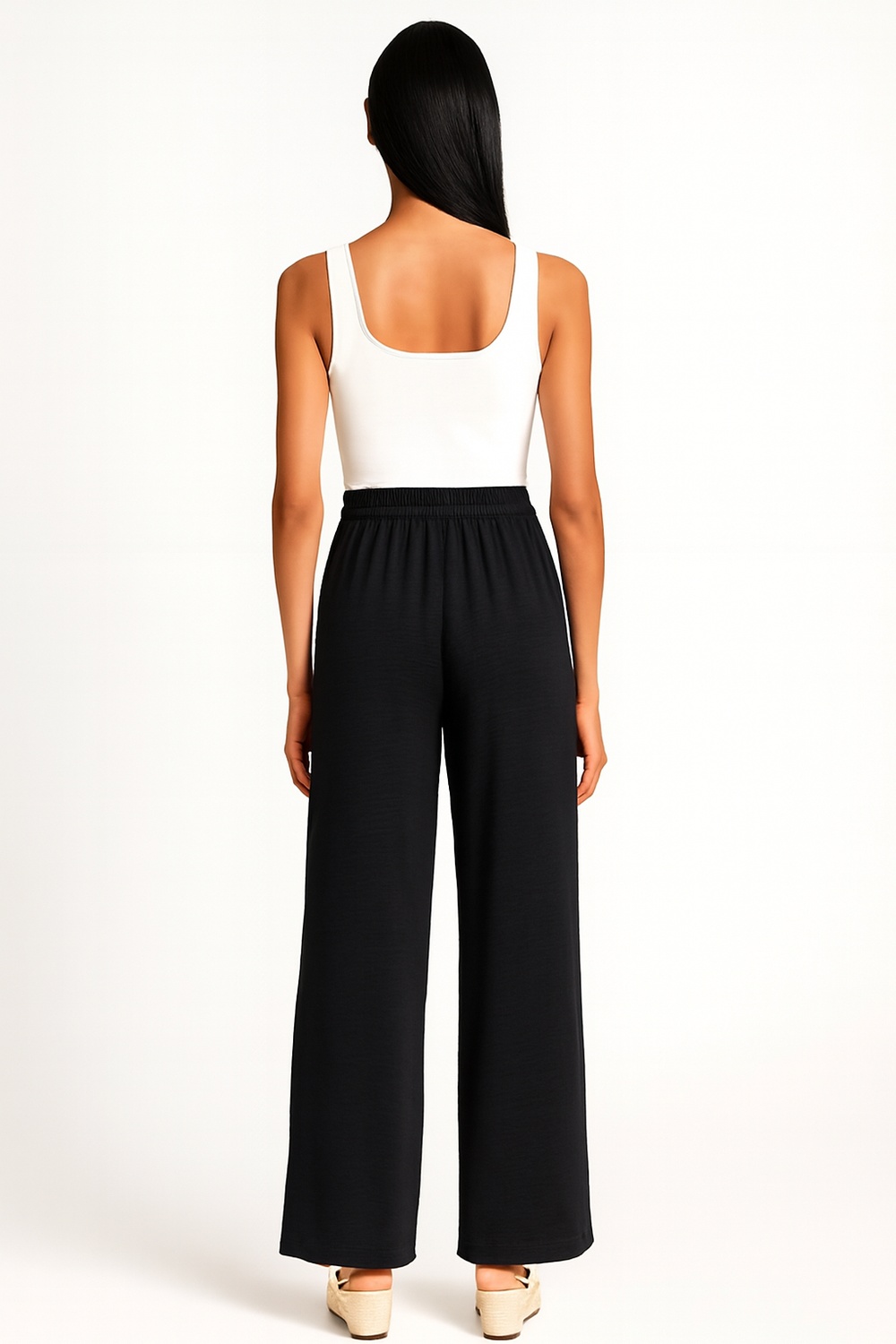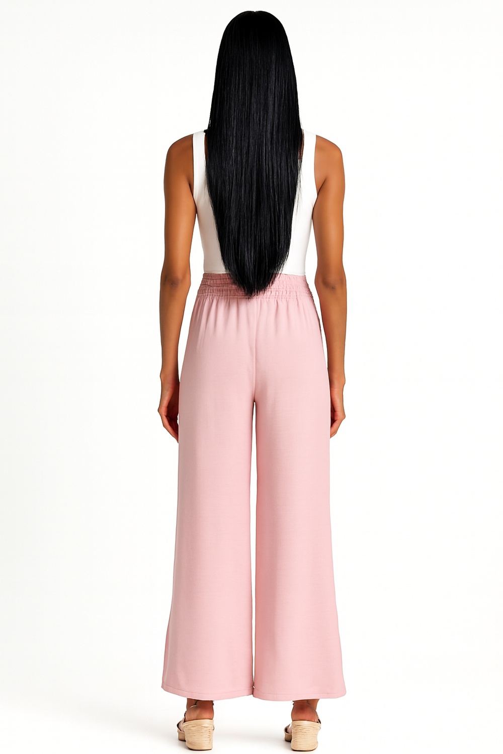 Pantalón de pierna amplia con caída fluida que alarga visualmente la figura, pretina elástica de ajuste cómodo que se adapta a la cintura, tiro medio que equilibra proporciones, corte recto desde cadera hasta bajo que aporta soltura, confección en tejido ligero de textura suave que brinda frescura y libertad de movimiento en cada paso