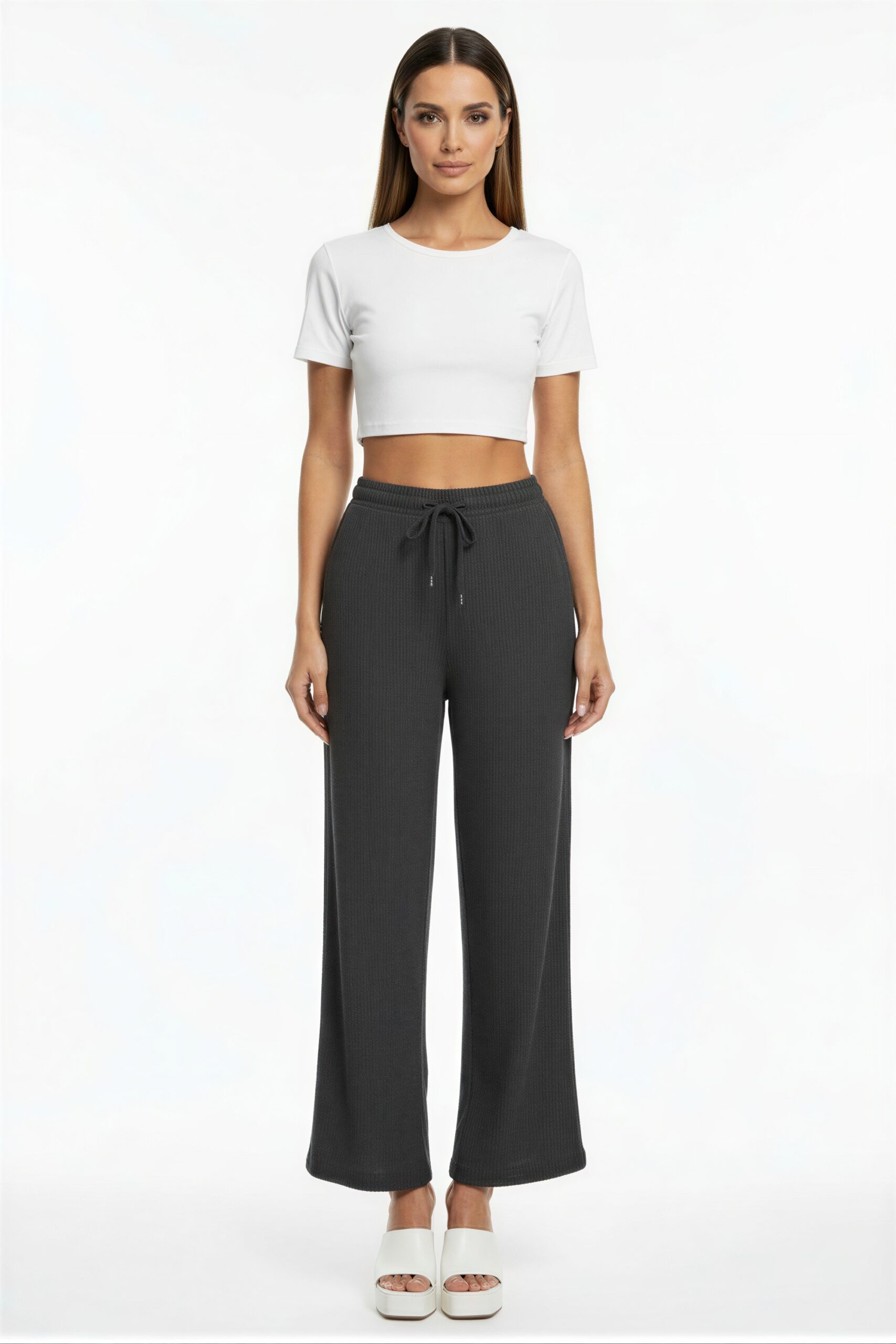 Capri con pretina elástica, cordón ajustable, bolsillos laterales, pierna amplia, tela ligera de tacto suave, diseño cómodo para movimiento diario