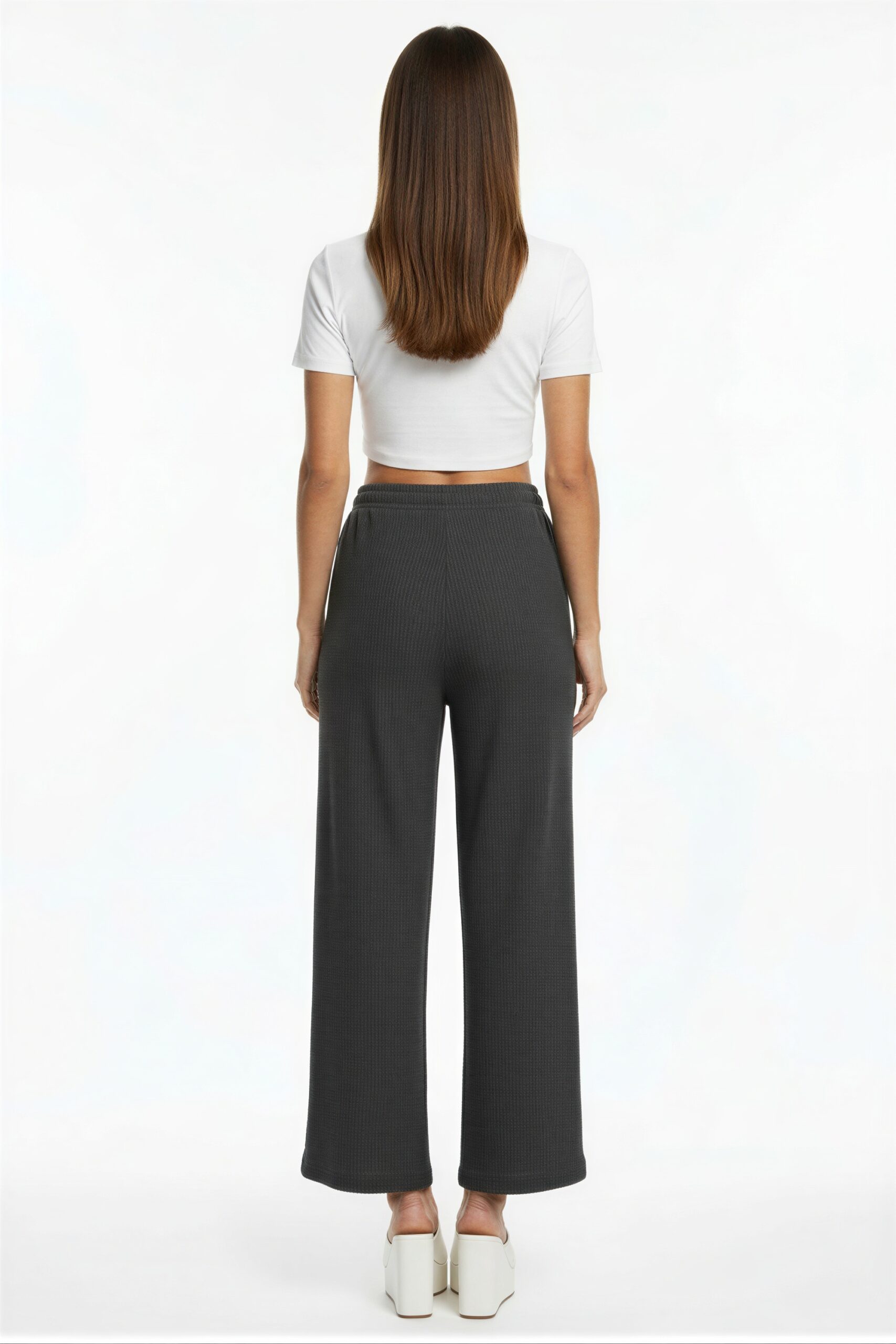 Pantalón de tiro medio con pretina trasera elástica y botón frontal, corte recto de pierna amplia que aporta comodidad y libertad de movimiento, bolsillos funcionales que suman practicidad al diseño, confección ligera con caída suave que mantiene una silueta definida