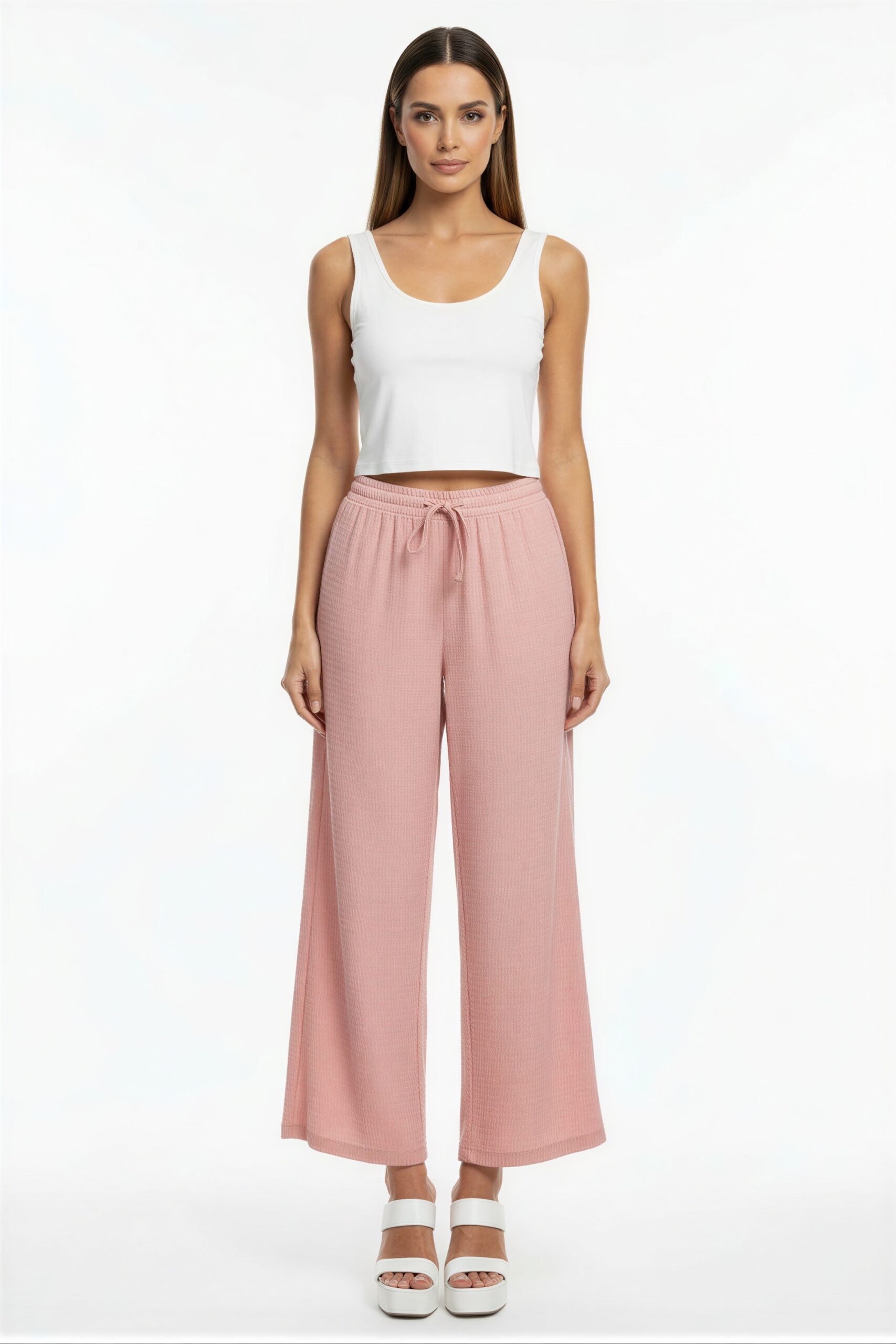 Pantalón de corte amplio, pretina elástica con ajuste de cordón, tiro medio, caída fluida, tejido ligero de tacto suave