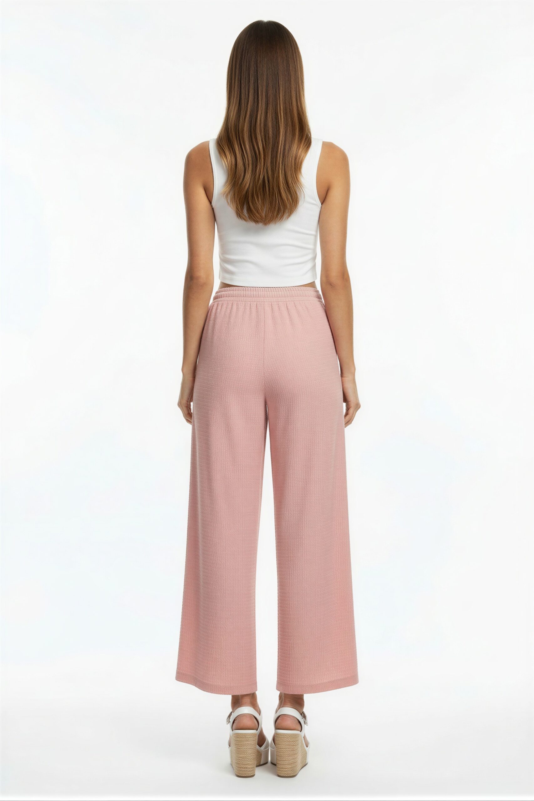 Pantalón de tiro medio con pretina elástica que facilita el ajuste, corte amplio en pierna que aporta comodidad, diseño de caída suelta que permite movilidad constante, largo regular con terminación recta, confección en tejido ligero de tacto suave