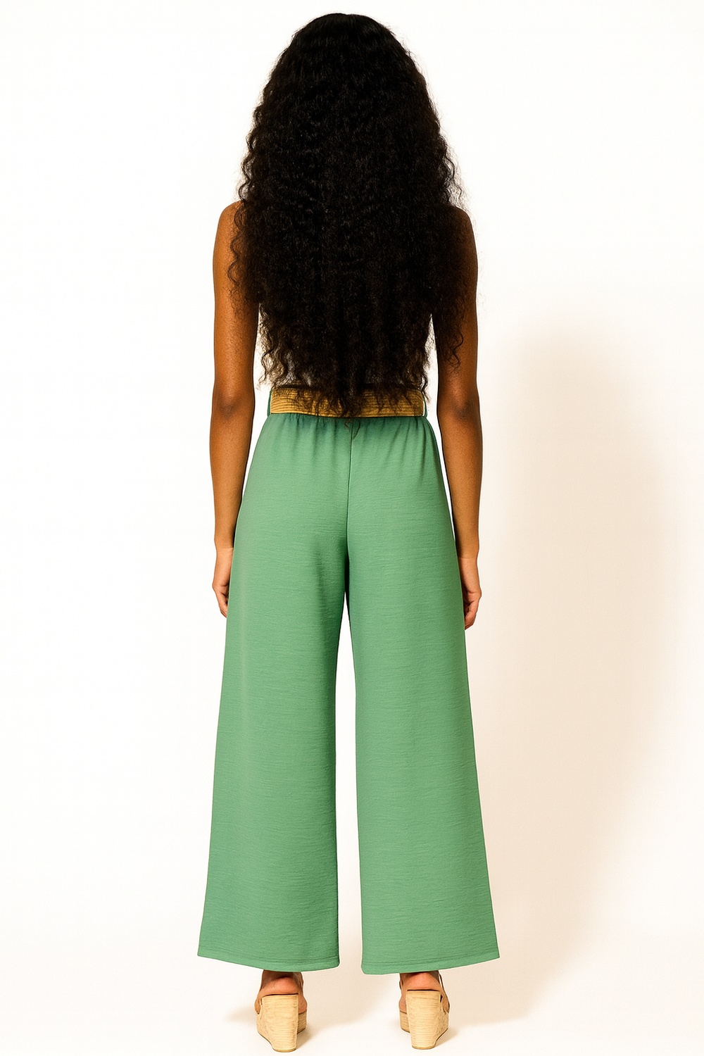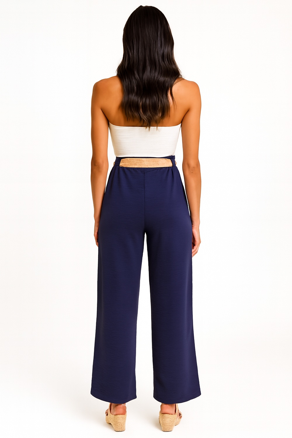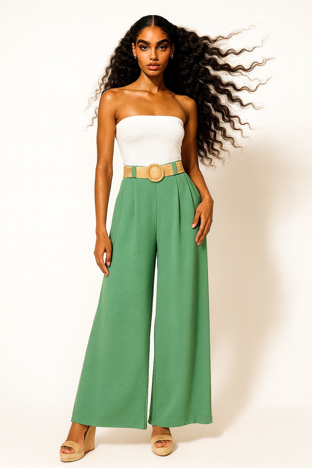 Pantalón de corte amplio con largo completo que estiliza la pierna y aporta movimiento fluido, diseño de tiro medio que brinda comodidad durante el uso, cinturón integrado con hebilla ancha que define el ajuste en la cintura y aporta estructura al frente, pinzas frontales que generan caída controlada y balance visual, confección en tejido ligero con textura suave y buena estabilidad en la forma