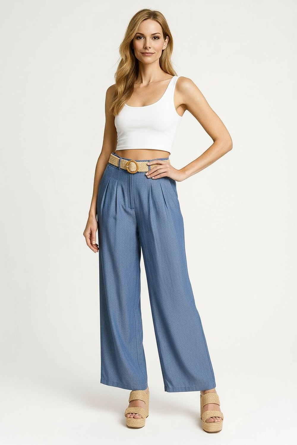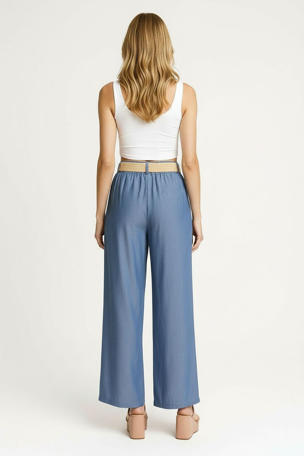 Pantalon amplio, pretina con cinturón incluido, pinzas frontales, pierna amplia con caída fluida, estructura ligera