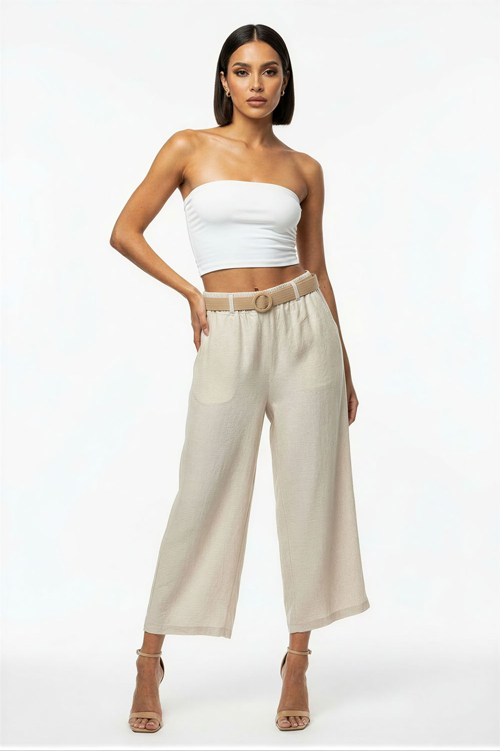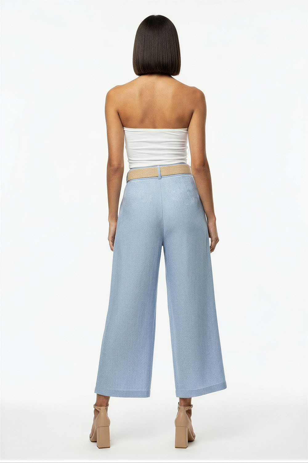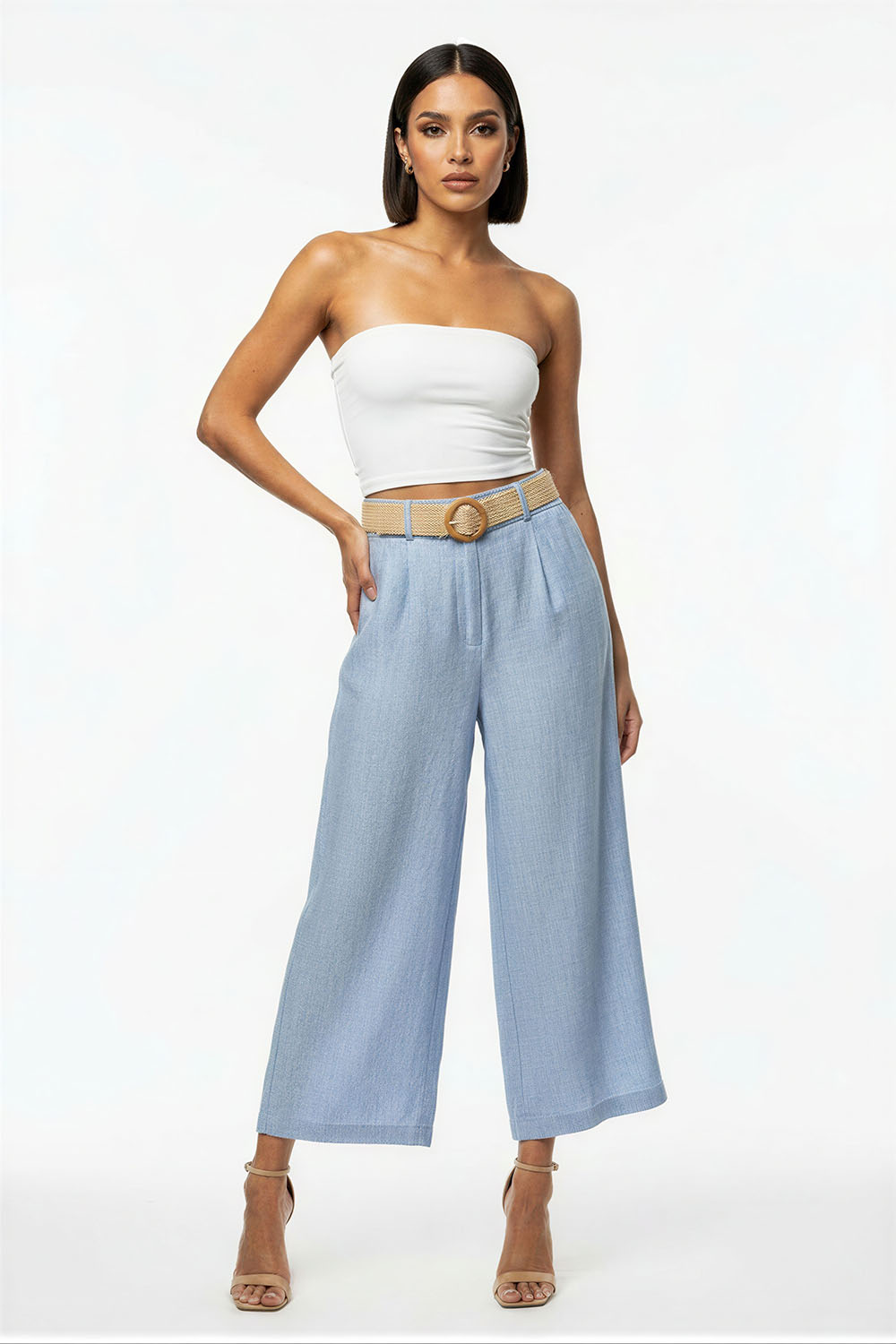 Pantalón de corte amplio con pinzas frontales que aportan estructura y caída fluida, tiro alto con pretina definida que brinda ajuste cómodo y estilizado, largo recto que alarga visualmente la silueta, diseño con cinturón integrado que aporta detalle funcional y decorativo, confección en tejido ligero de tacto suave que permite libertad de movimiento y uso prolongado