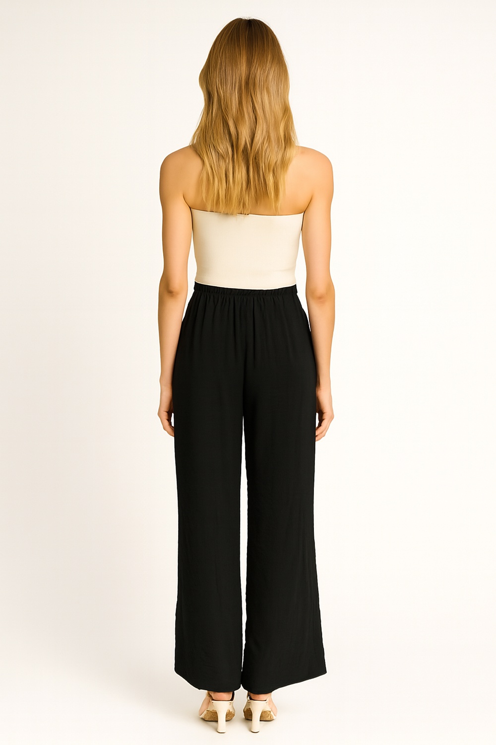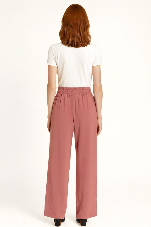 Pantalón formal corte amplio, tiro medio, pretina delgada de elástico con trabas y listón contraste