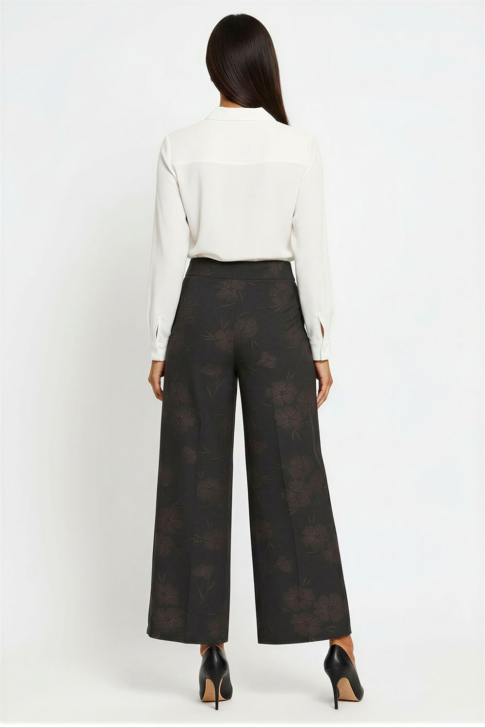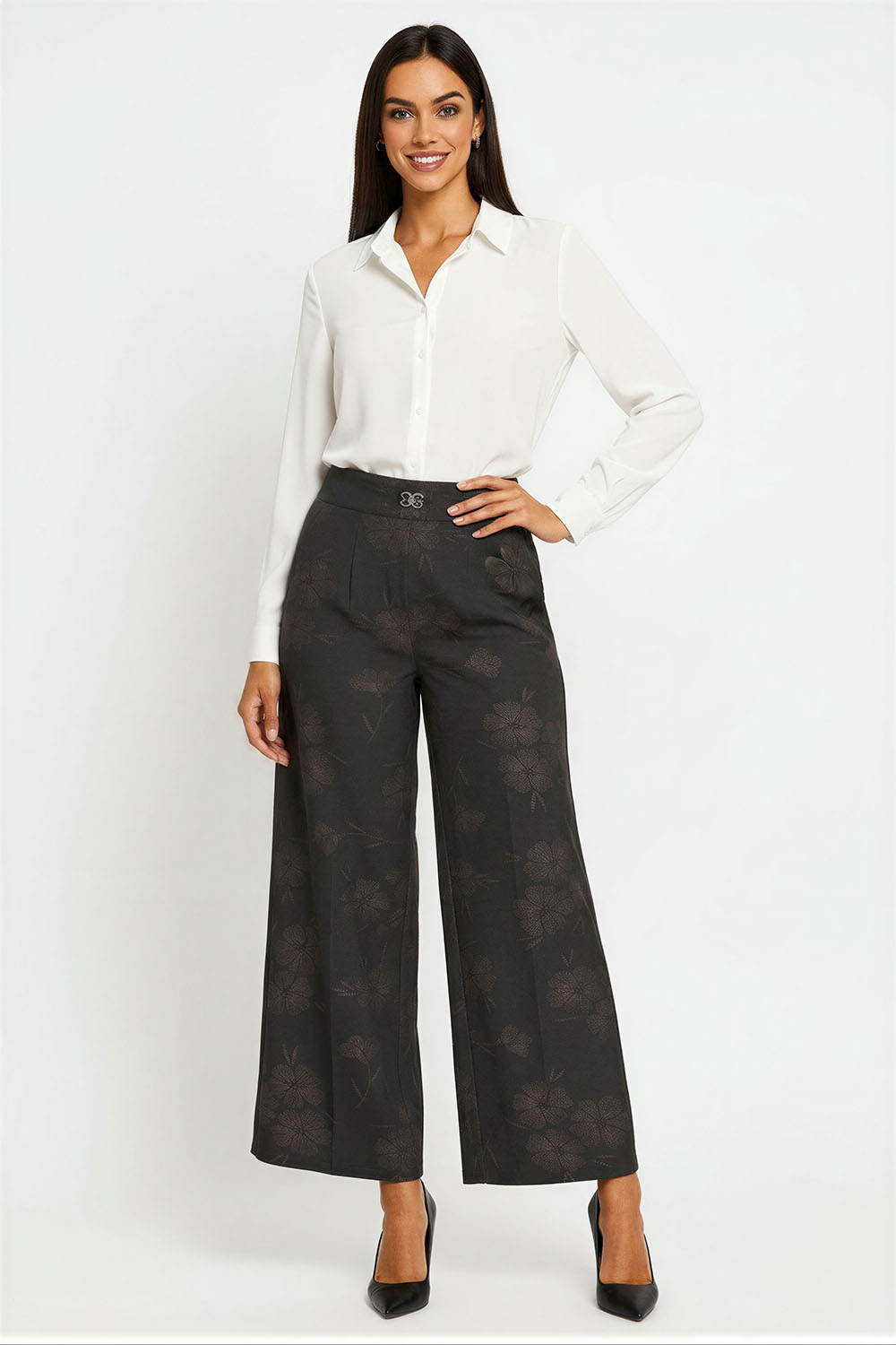 Pantalón de tiro medio con pretina cruzada que aporta ajuste estructurado, aplicación decorativa frontal que añade detalle distintivo, corte recto que estiliza la silueta, largo regular que brinda versatilidad en el uso, confección firme que mantiene la forma durante el día