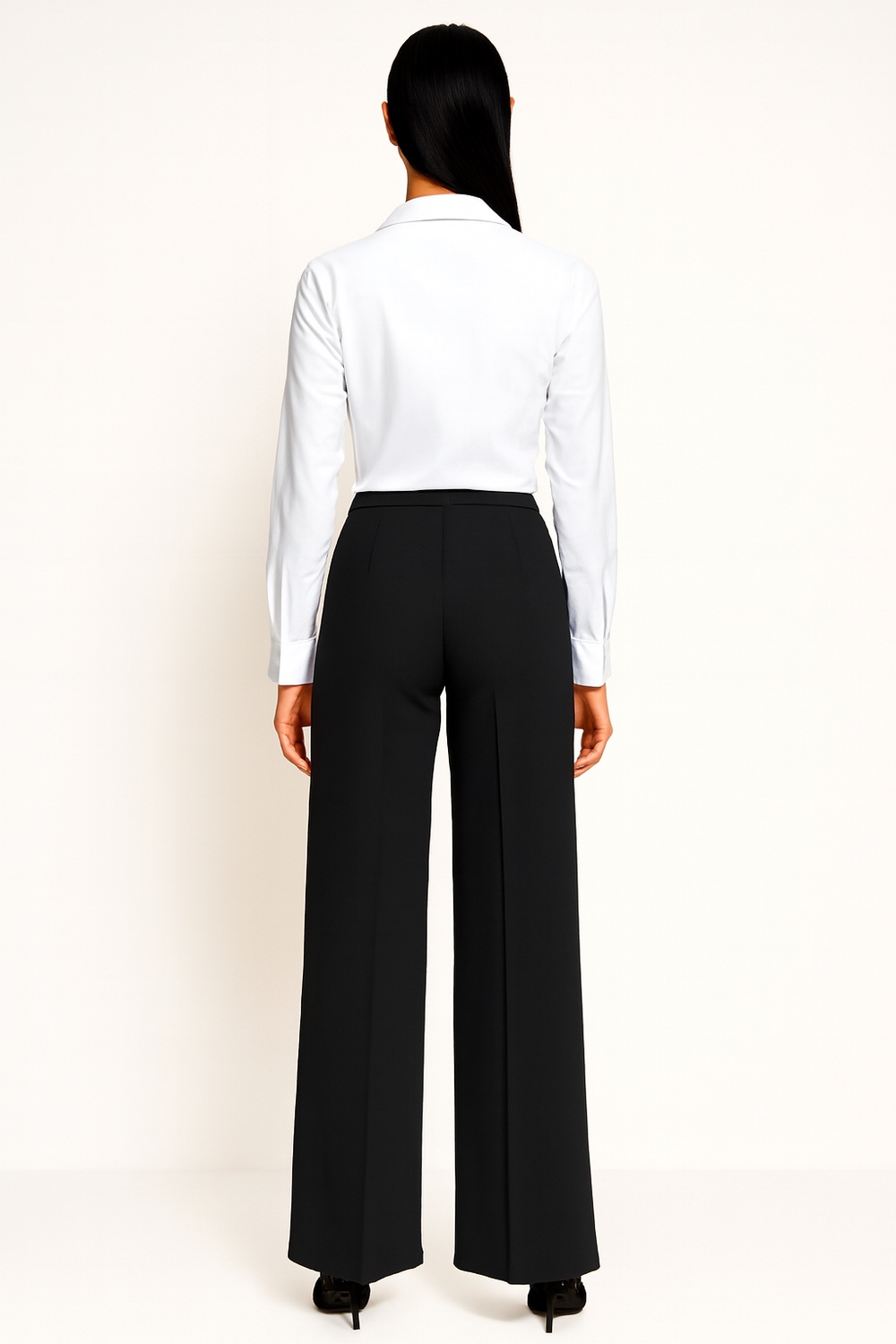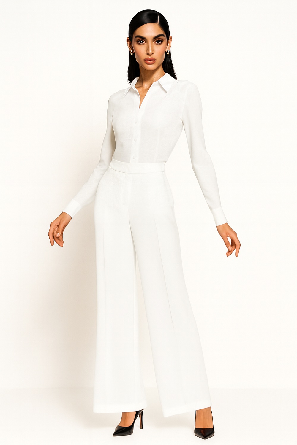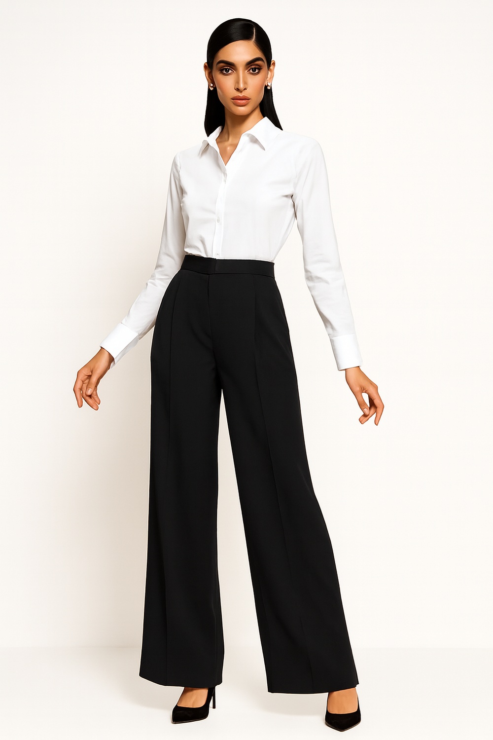 Pantalón amplio de tiro medio con pinzas frontales que aportan mejor ajuste en cintura, pretina estructurada con doble botón decorativo que refuerza la firmeza al cerrar, pierna recta de caída amplia que estiliza visualmente, largo completo que alarga la silueta, confección en tela de textura suave con excelente caída y comodidad durante todo el día