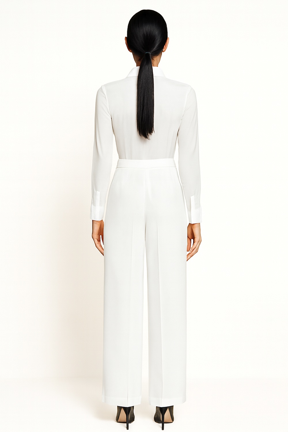Pantalón de tiro alto con silueta acampanada que equilibra la figura, cintura estructurada con hebilla decorativa integrada que aporta firmeza, largo completo que estiliza la línea de la pierna, confección en tejido con elasticidad moderada para mayor confort, terminación limpia en bajos
