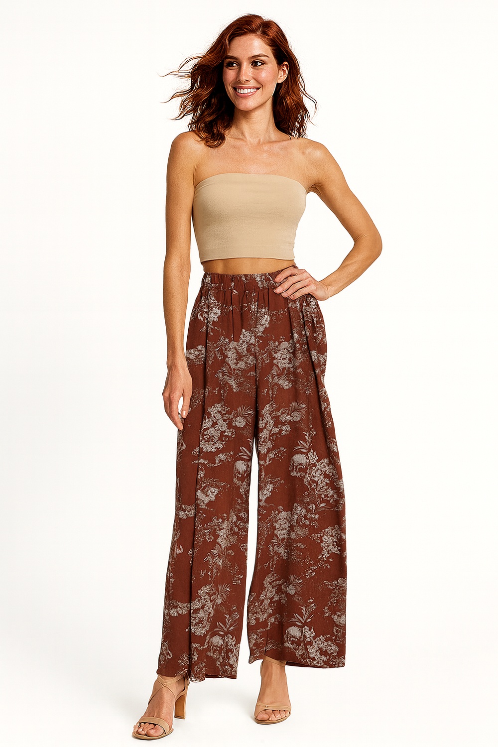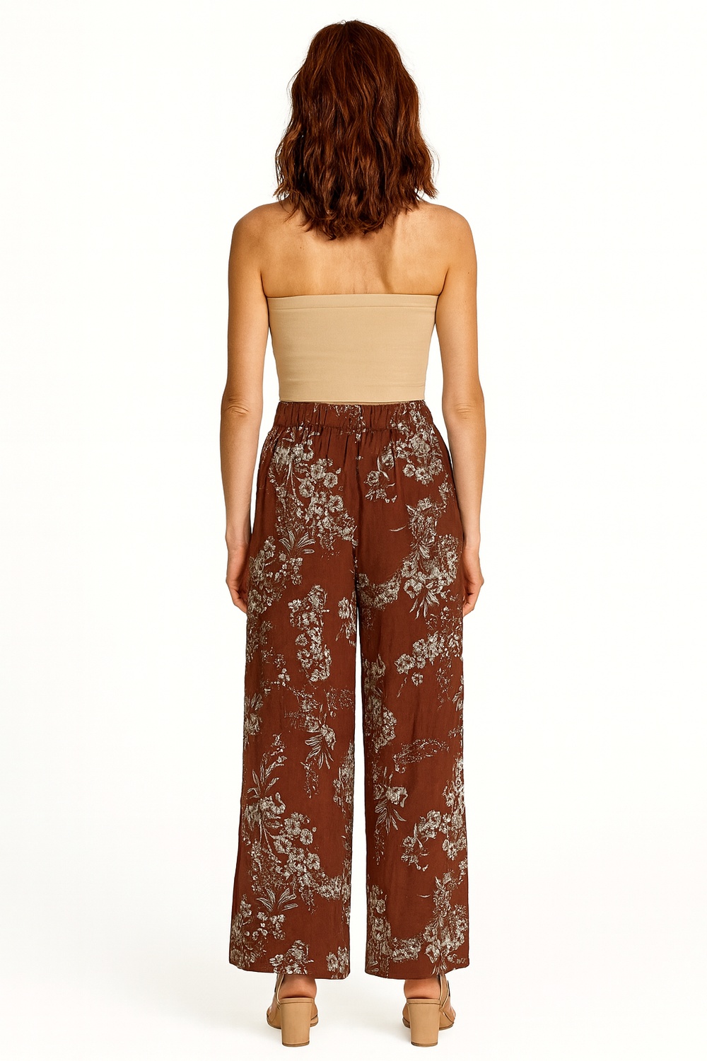 Pantalón full print colorido, corte amplio, tiro medio, pretina ancha de smock con cinta de amarre