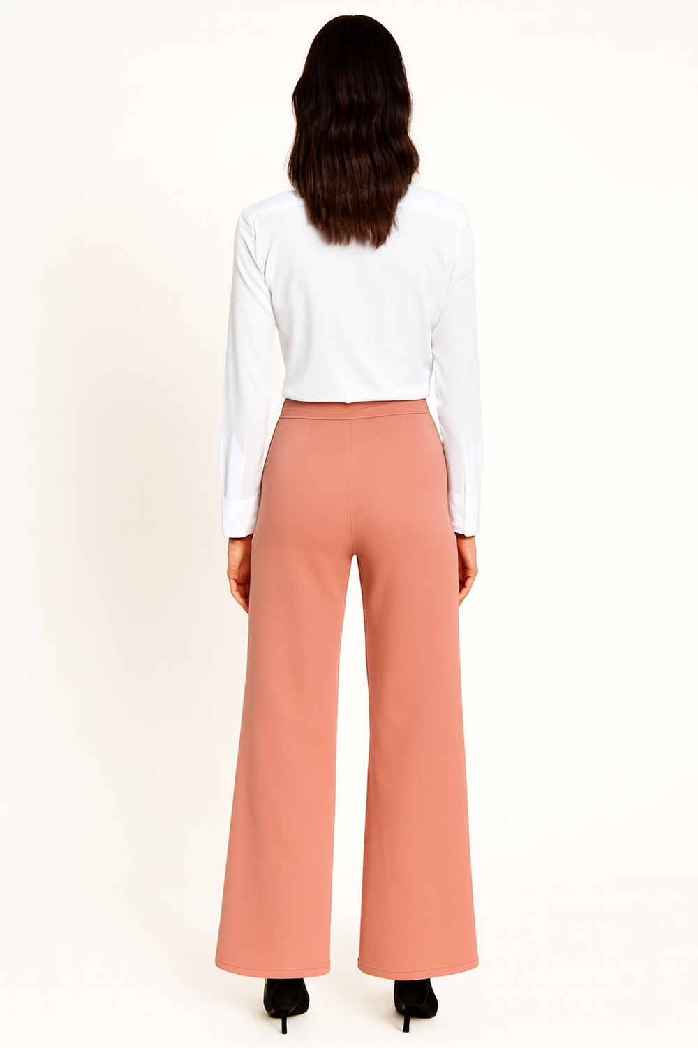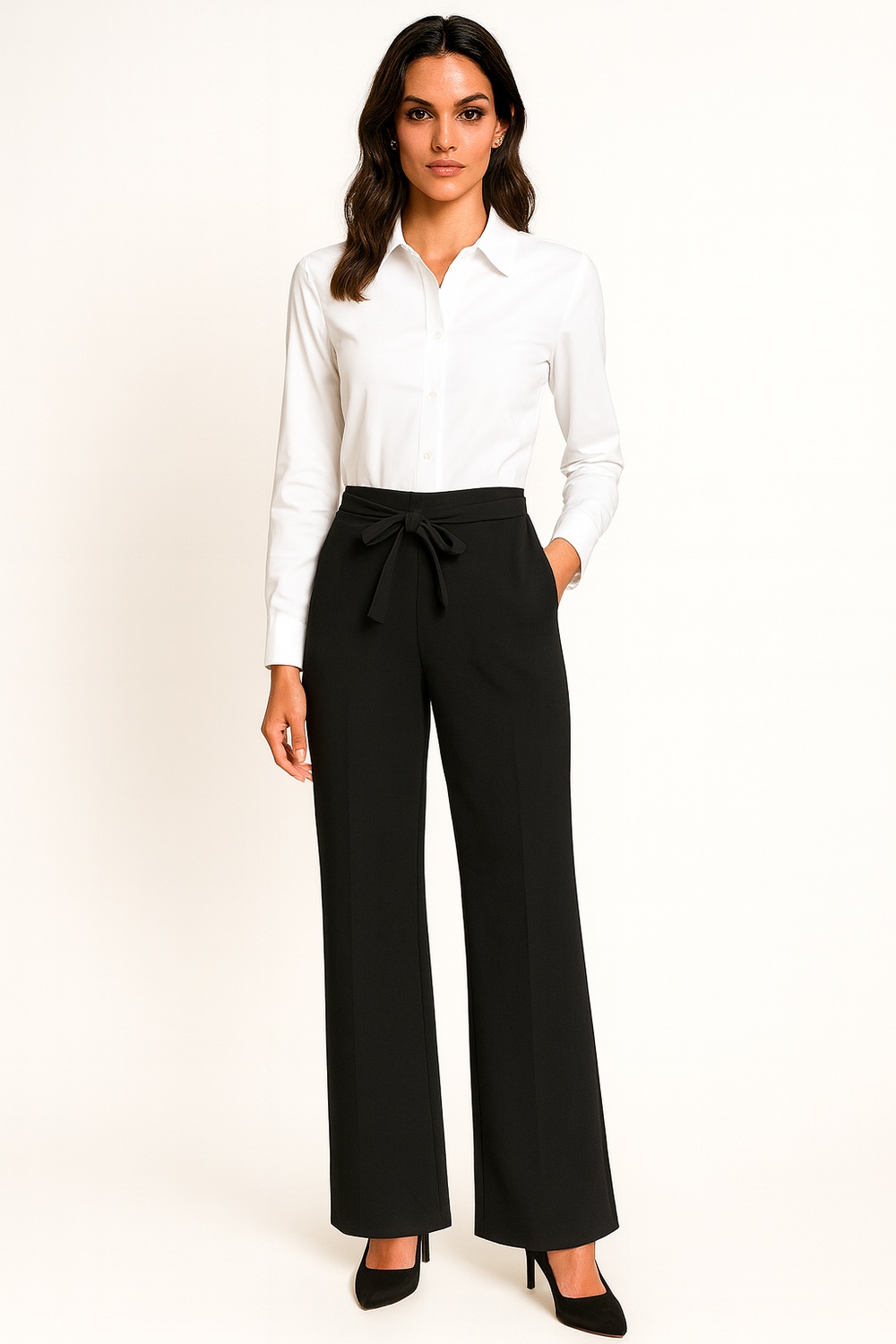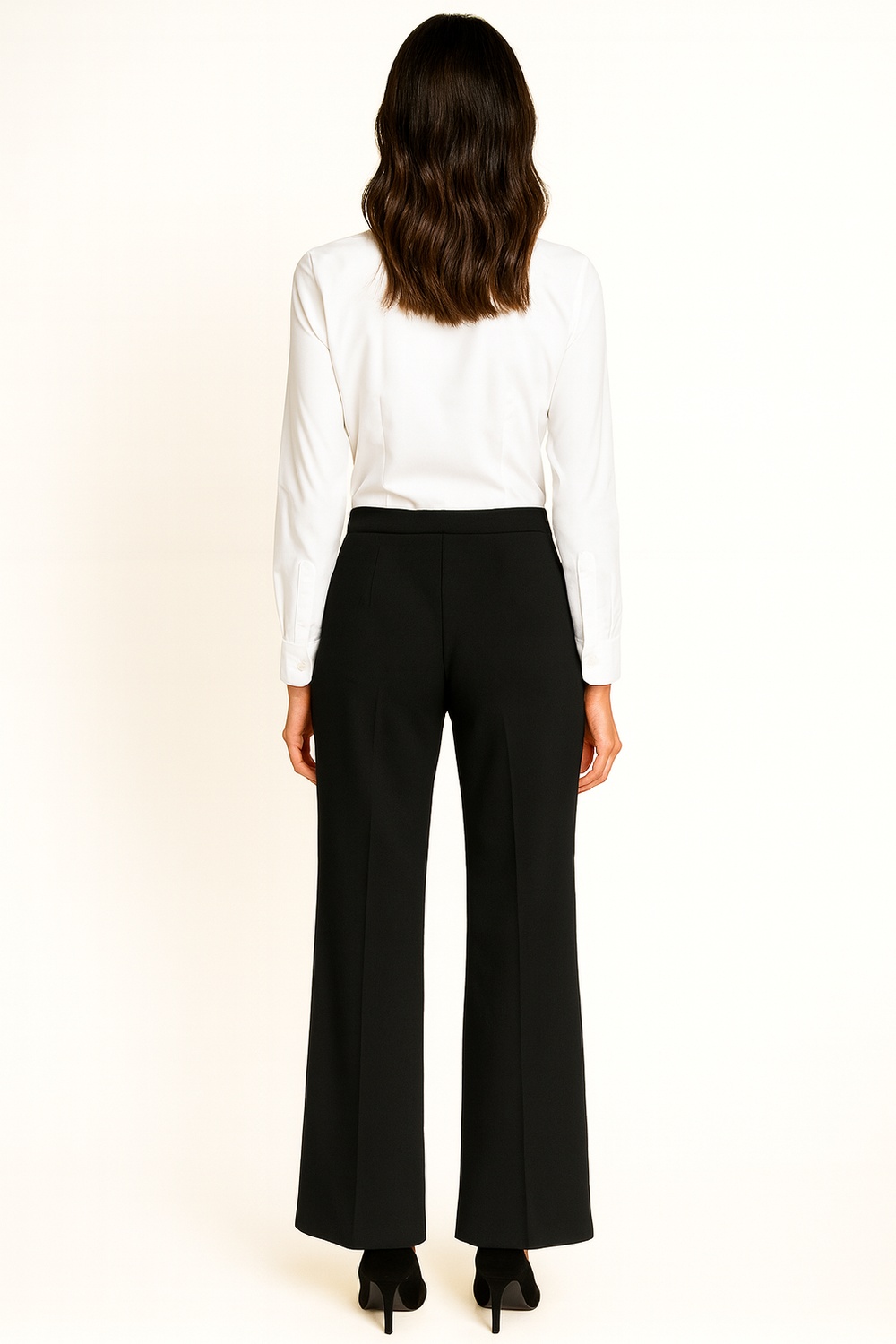 Pantalón de pretina dividida con doble trabilla que ofrece ajuste firme y mayor soporte, cierre frontal con botón metálico y cremallera oculta que aportan funcionalidad, bolsillos laterales discretos que brindan practicidad, corte recto con planchado marcado al frente que estiliza la silueta y alarga visualmente las piernas, confección en tela estructurada que conserva la forma y permite comodidad durante el uso diario o en ocasiones formales